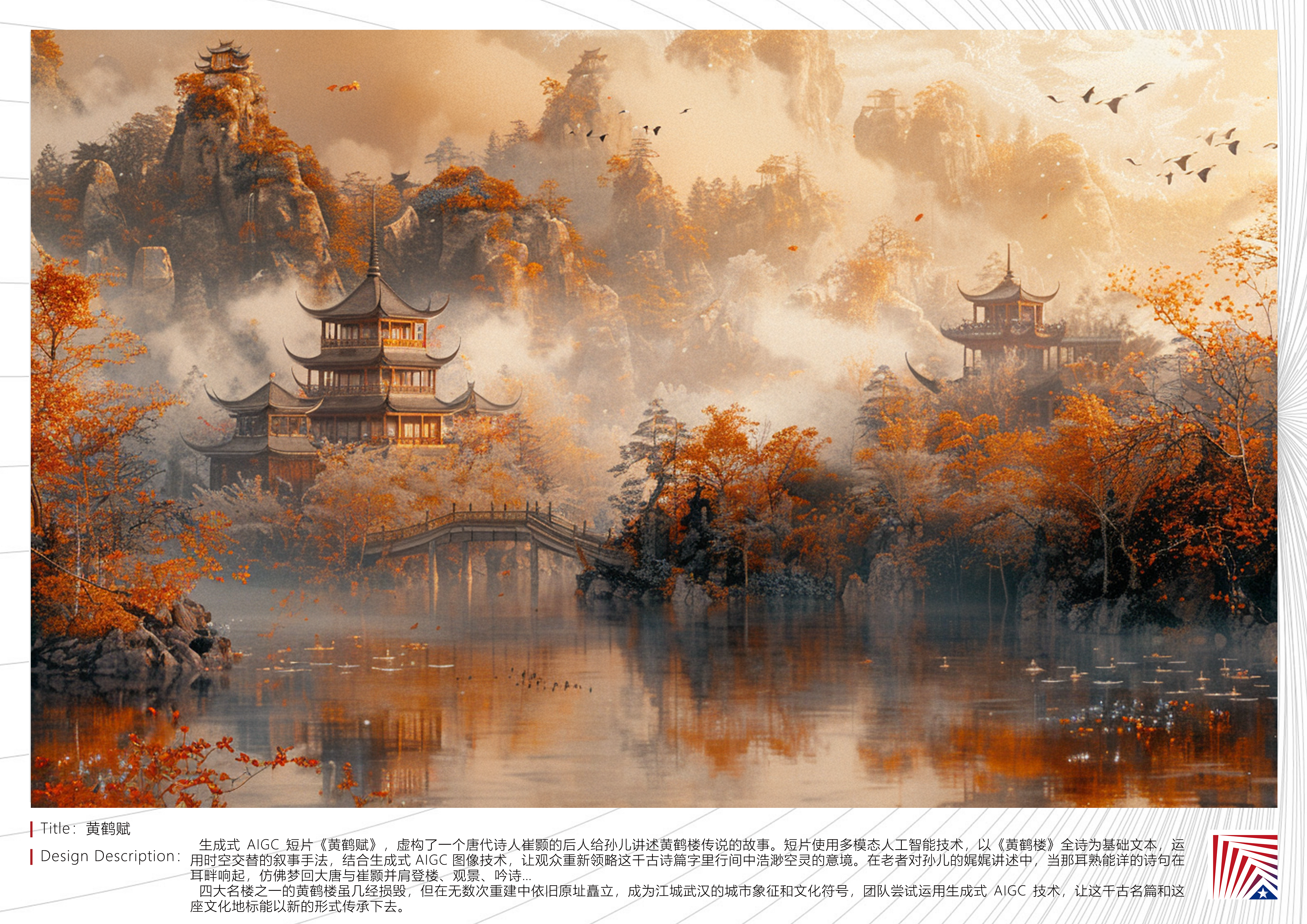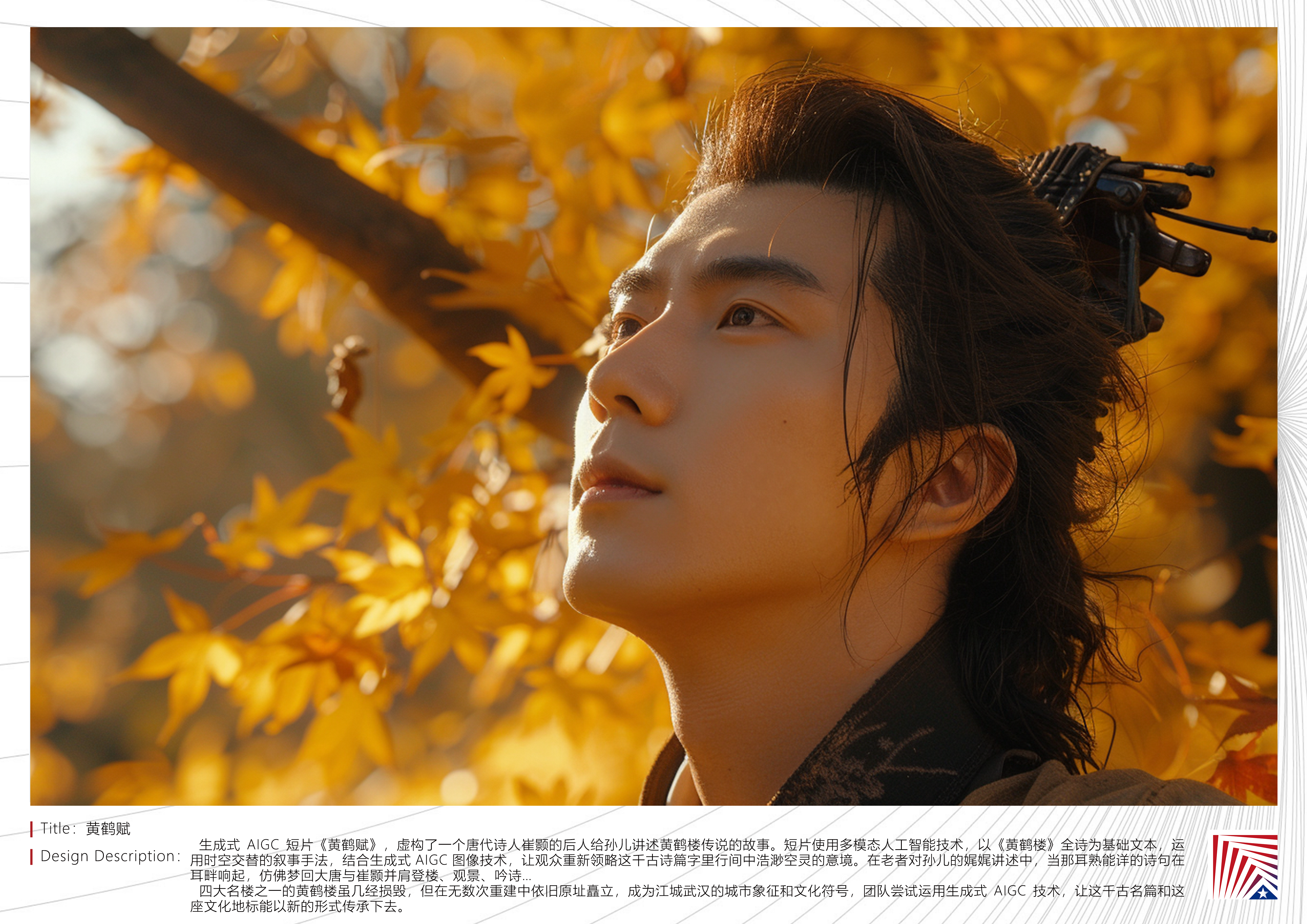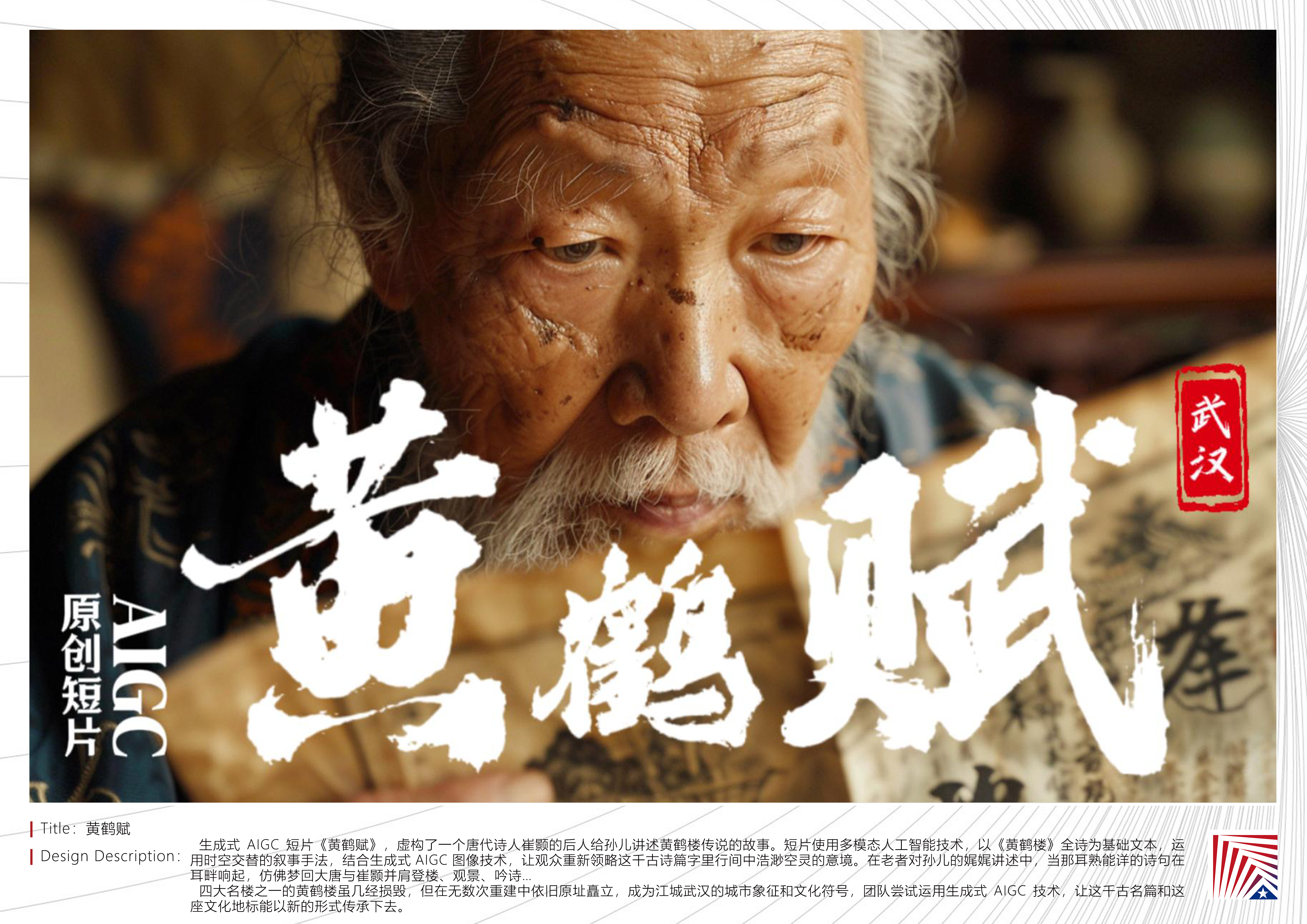 作品说明:生成式 AIGC 短片《黄鹤赋》,虚构了一个唐代诗人崔颢的后人给孙儿讲述黄鹤楼传说的故事。短片使用多模态人工智能技术,以《黄鹤楼》全诗为基础文本,运用时空交替的叙事手法,结合生成式 AIGC 图像技术,让观众重新领略这千古诗篇字里行间中浩渺空灵的意境。在老者对孙儿的娓娓讲述中,当那耳熟能详的诗句在耳畔响起,仿佛梦回大唐与崔颢并肩登楼、观景、吟诗…