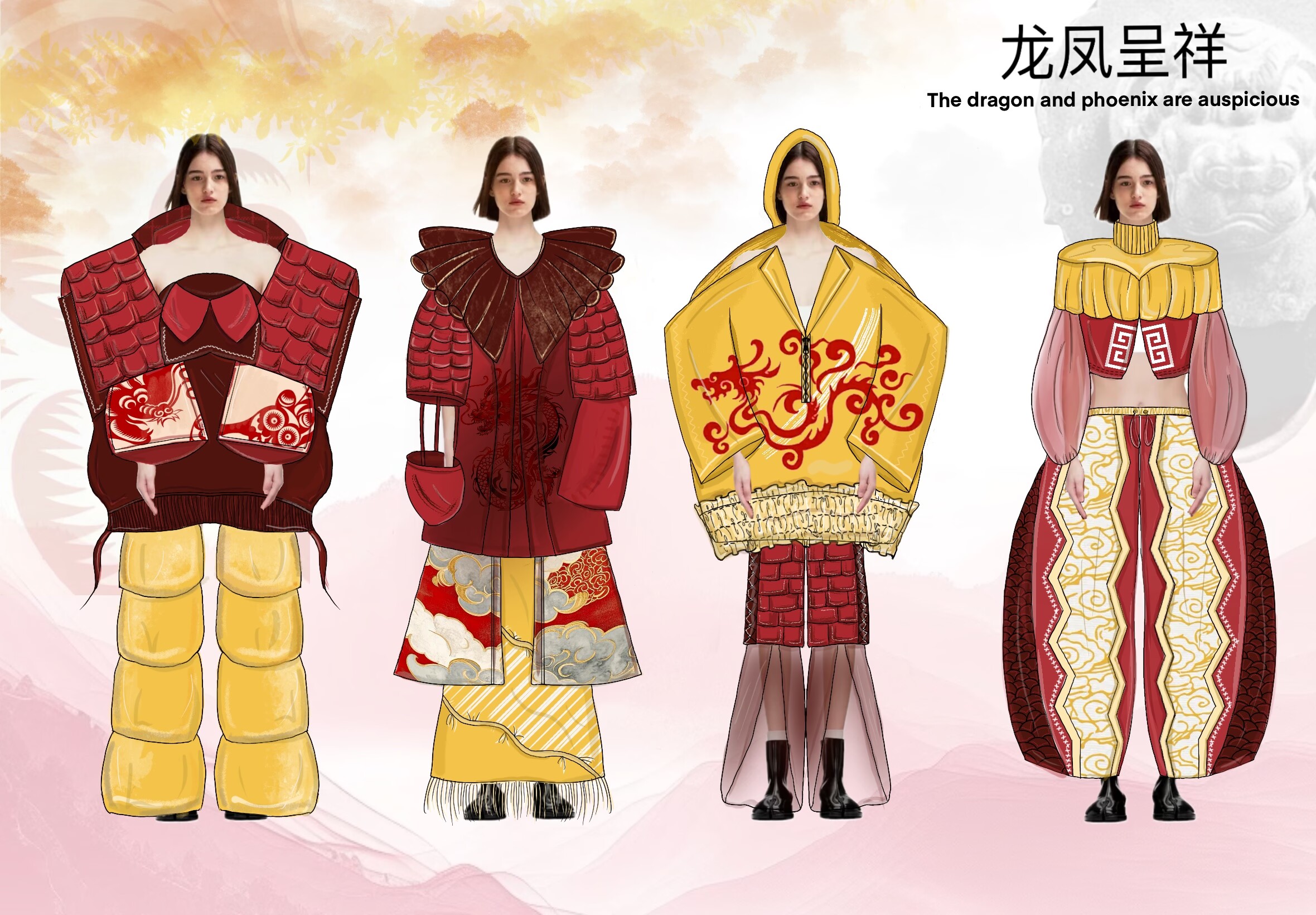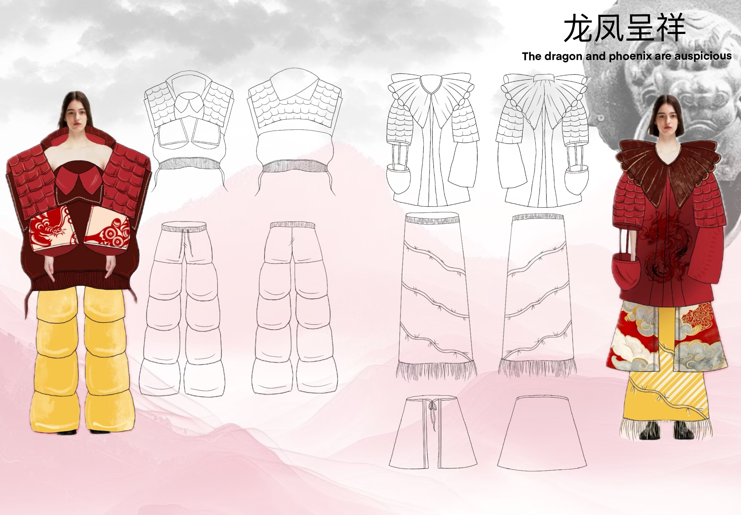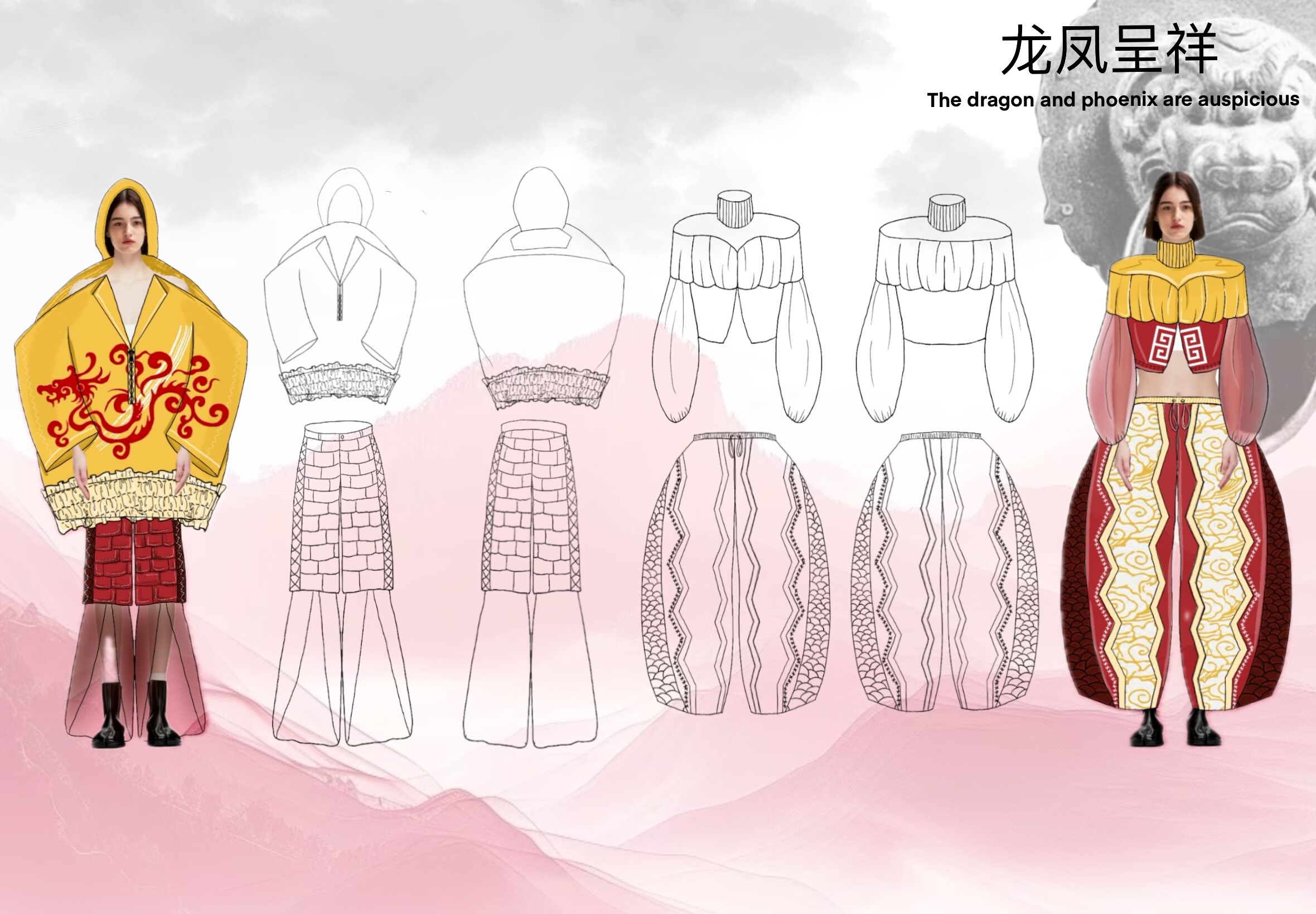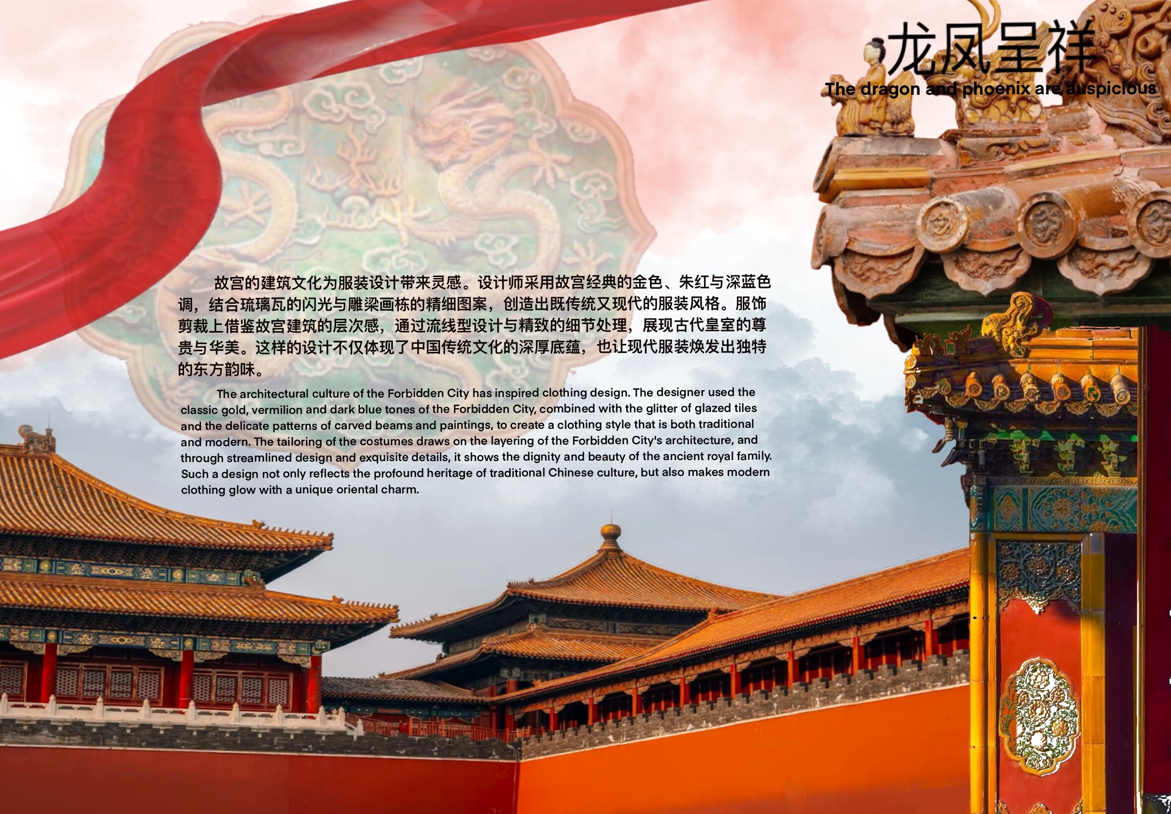 作品说明:这款服装亮点特色鲜明。它从故宫建筑文化中寻得灵感,色彩上大胆选用金色与朱红搭配,金色彰显尊贵,朱红饱含热烈,交织出浓郁传统韵味。图案融入琉璃瓦闪光质感与雕梁画栋精细纹样,宛如流动的宫廷画卷,华美精致。剪裁借鉴建筑层次感,采用流线型设计,线条流畅且具韵律。衣领、袖口等细节设计巧妙,既保留古代服饰典雅,又契合现代审美,将传统文化与现代时尚完美融合,尽显东方独特魅力。