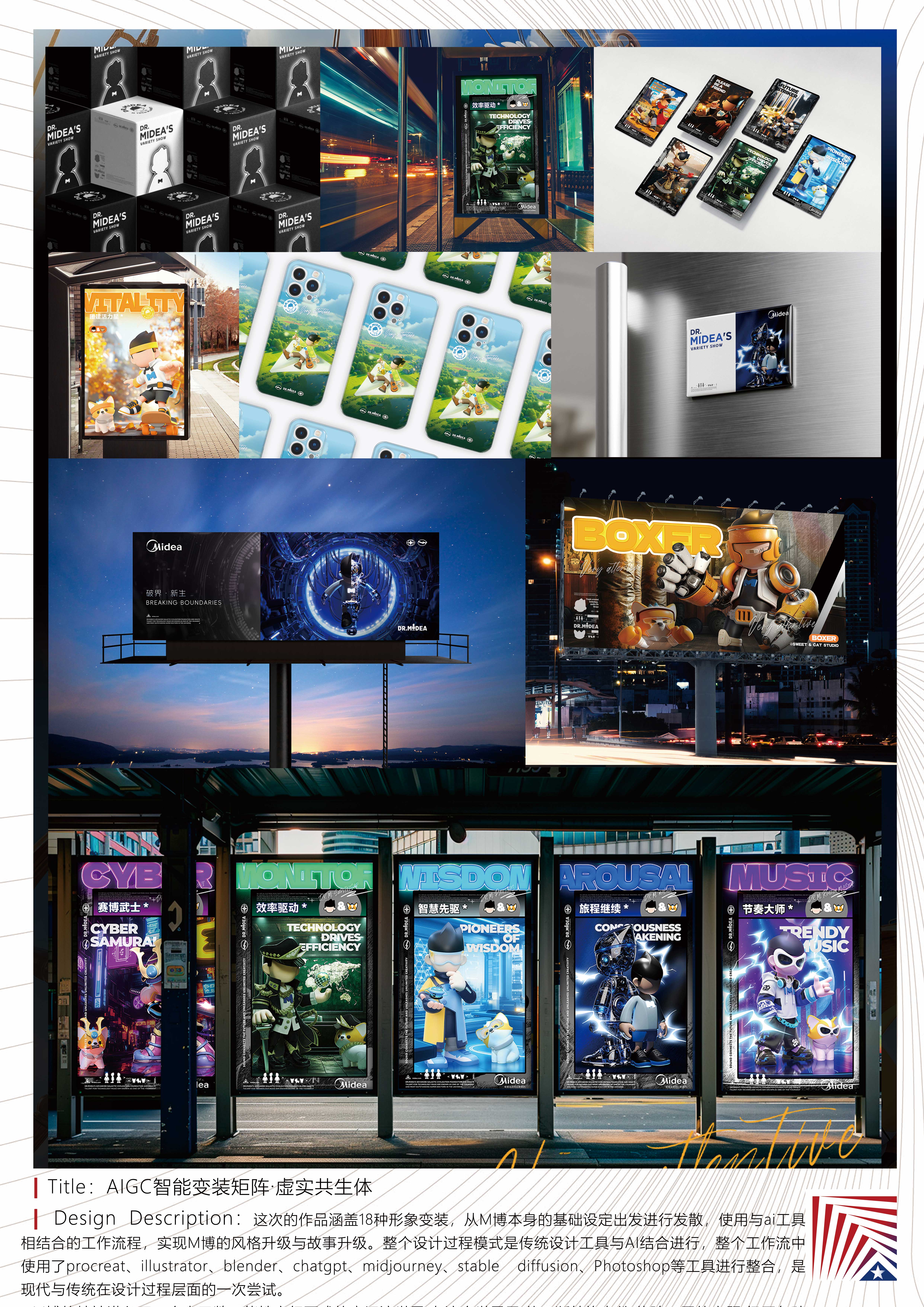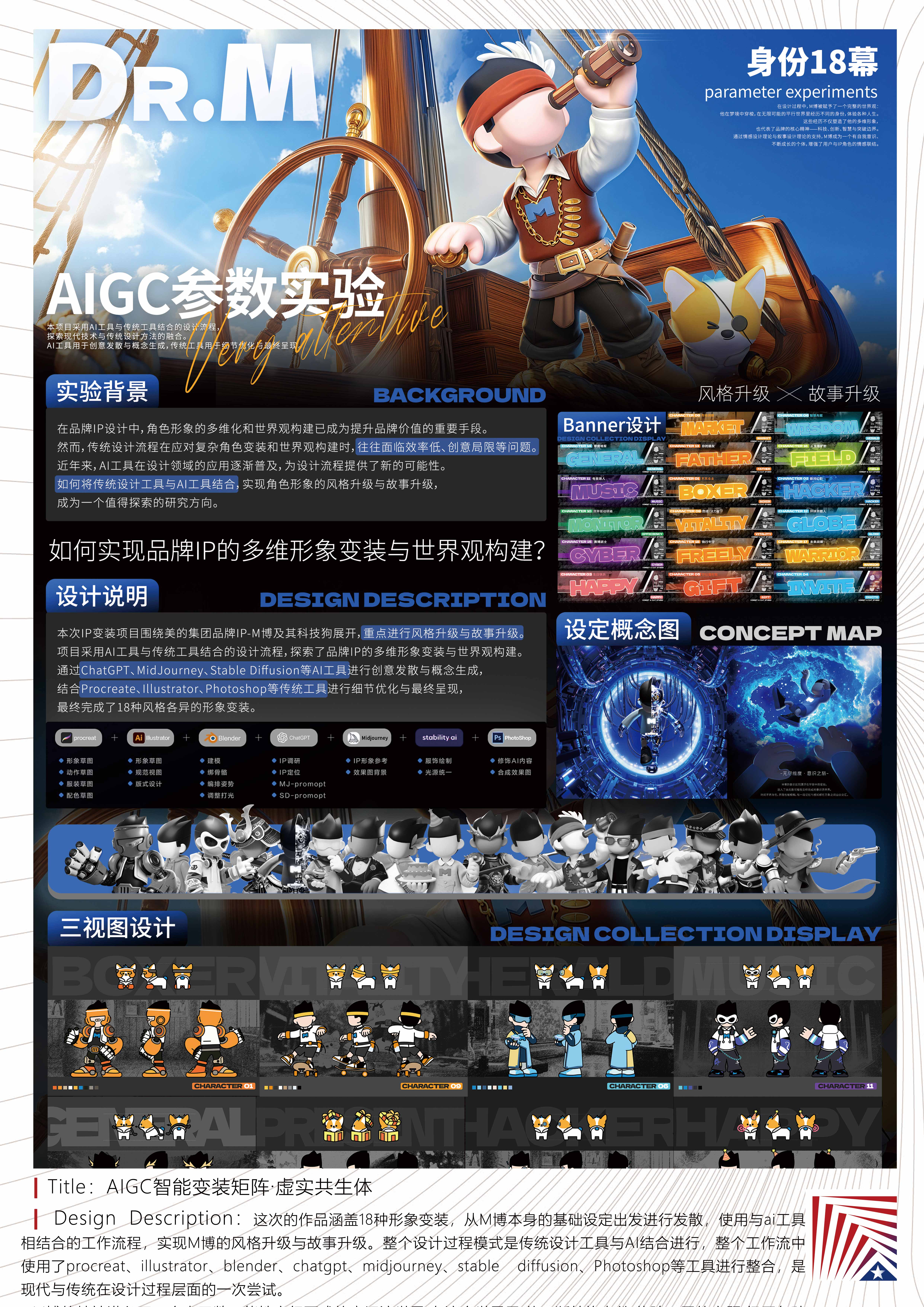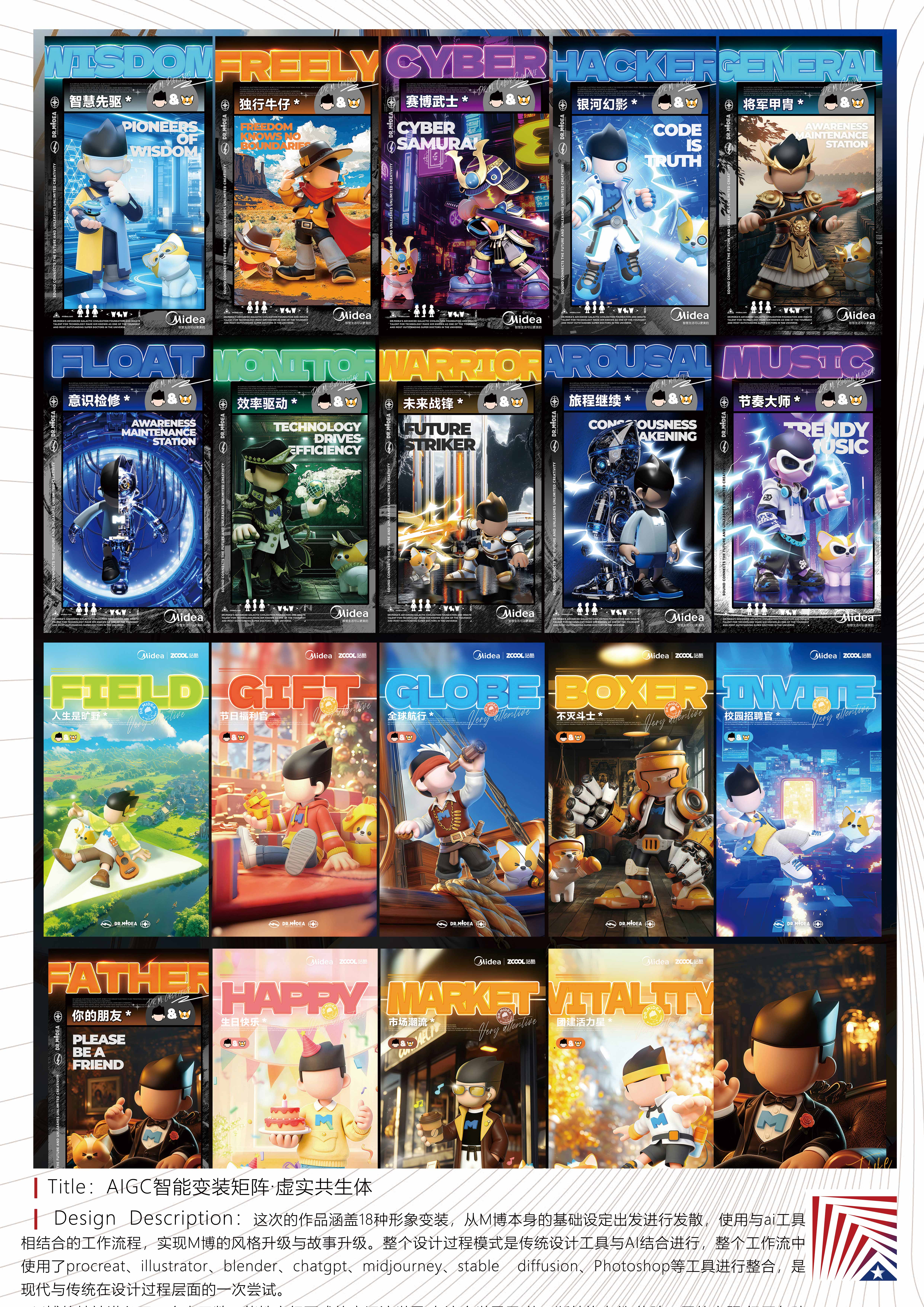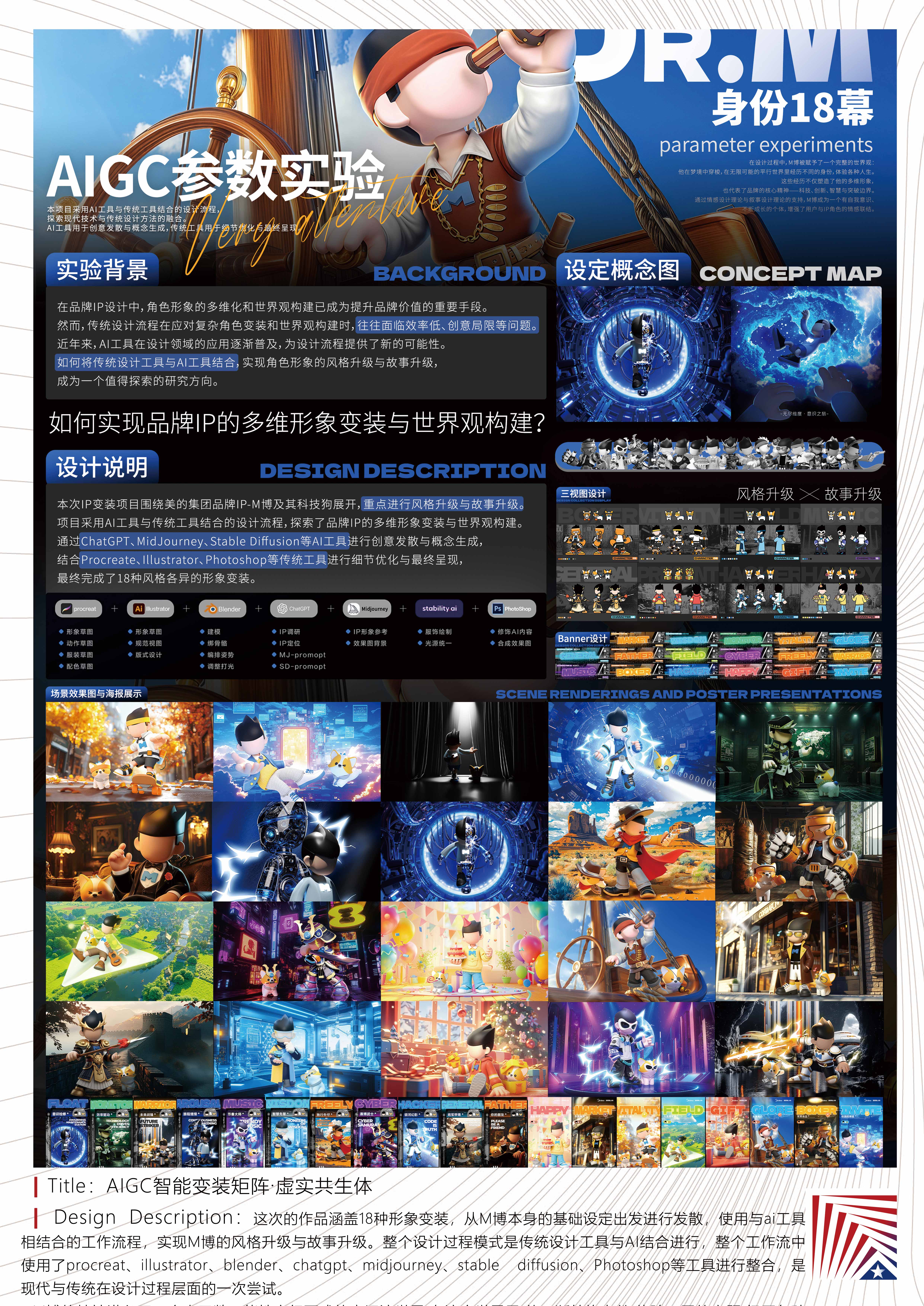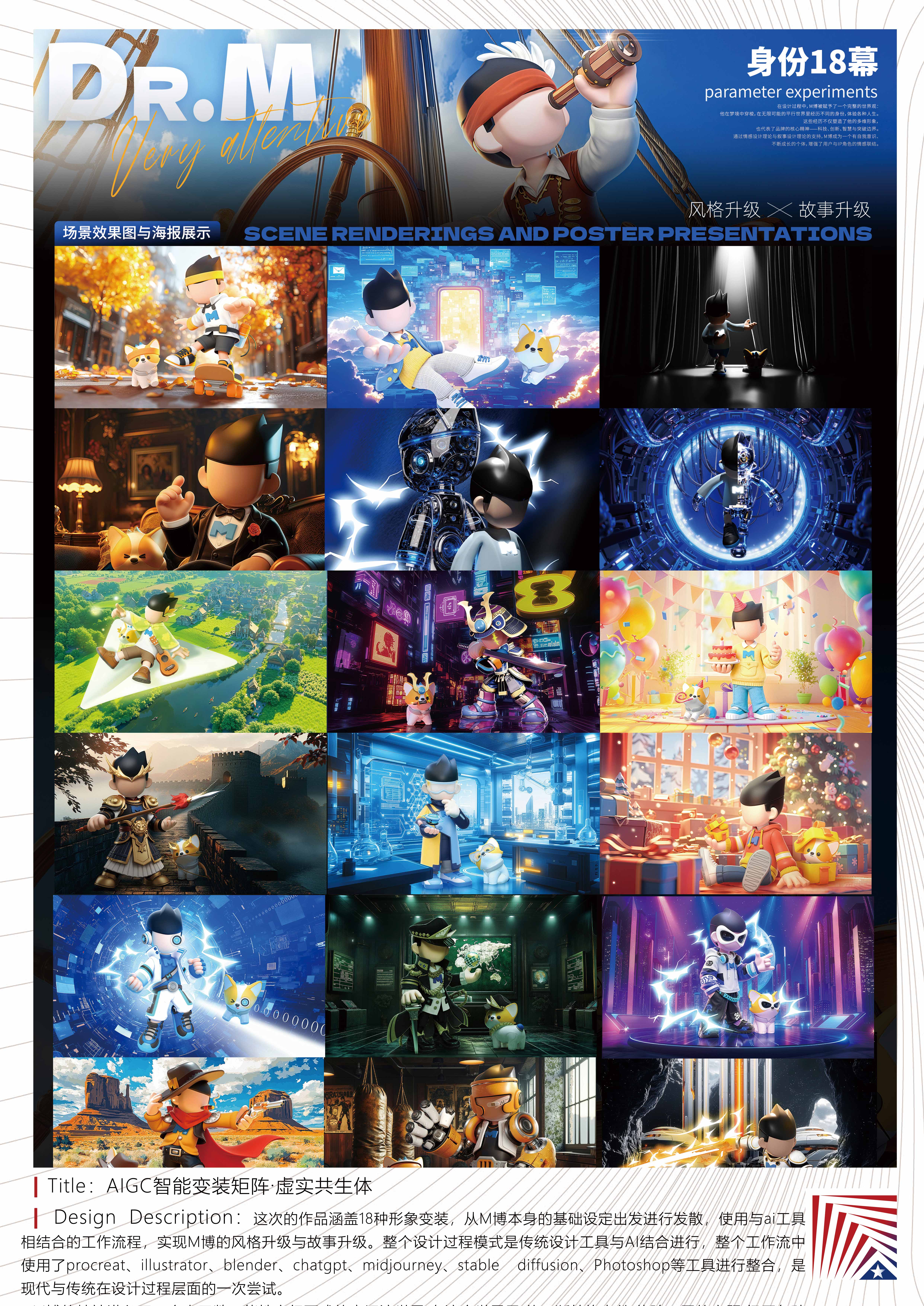 作品说明:这次的作品涵盖18种形象变装,从M博本身的基础设定出发进行发散,使用与ai工具相结合的工作流程,实现M博的风格升级与故事升级。整个设计过程模式是传统设计工具与AI结合进行,整个工作流中使用了procreat、illustrator、blender、chatgpt、midjourney、stable diffusion、Photoshop等工具进行整合,是现代与传统在设计过程层面的一次尝试。不仅在外观上进行潮流化、个性化的演绎,还赋予M博完整的世界观,使其拥有灵魂,成为真正经历、体验这些主题的存在。M博不只是一个角色形象,而是一个有自我意识不断成长的个体。他在梦境中穿梭,在无限可能的平行世界里经历不同的身份,体验各种人生他的每一场梦,都是一次关于科技、未来智慧生活的探索。