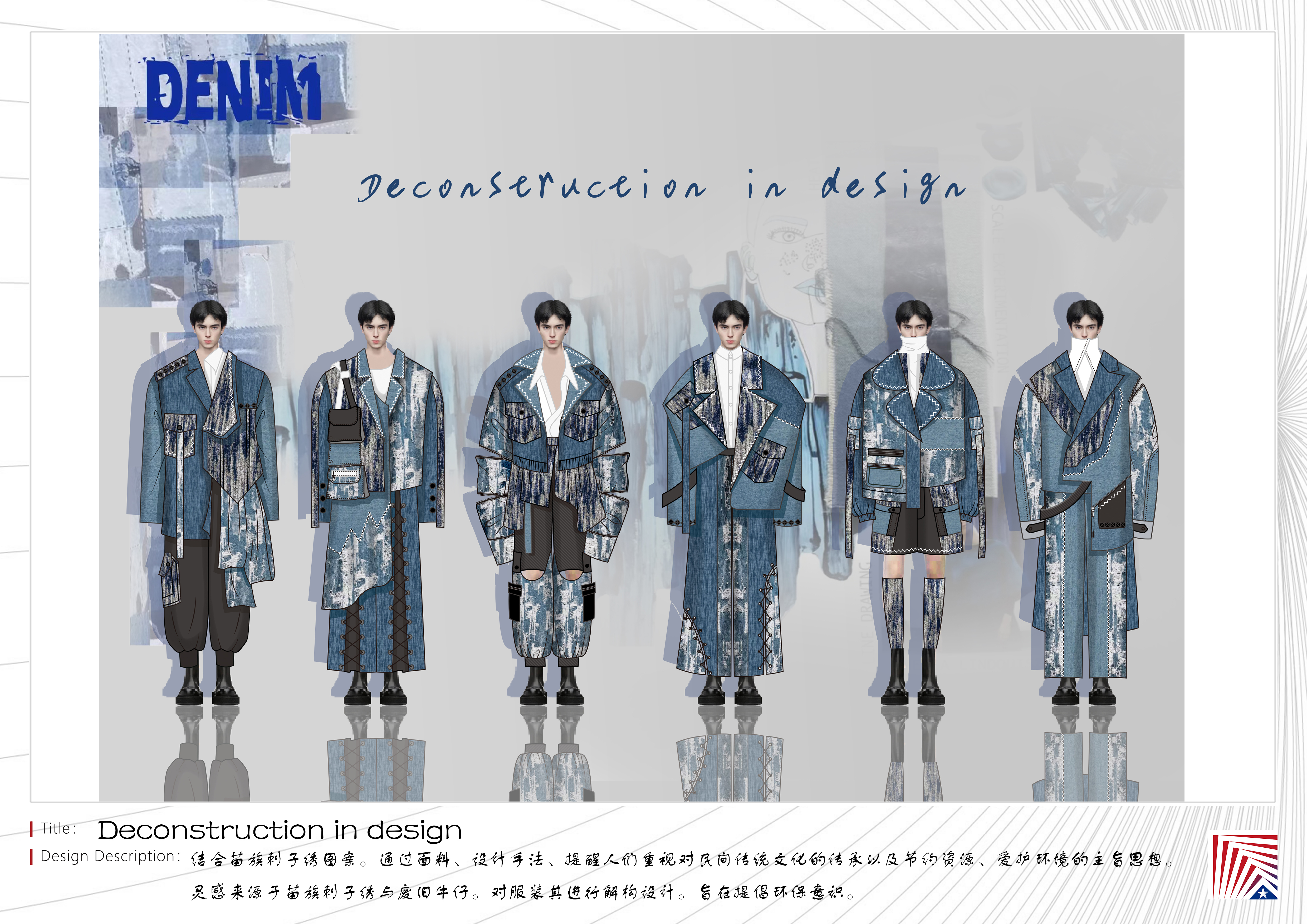 灵感:灵感来源于苗族刺子绣与废旧牛仔。对服装其进行解构设计。旨在提倡环保意识。 面料:以收集得来的废旧牛仔纯棉面料为主,面料具有穿着痕迹,复古破旧纹理,线迹以及不规则表面。内搭与裤装也采用纯棉面料。配饰方面加入了灯芯绒材质面料,结合于苗族刺子绣(十字绣棉线),让服装整体更有层次于质感。