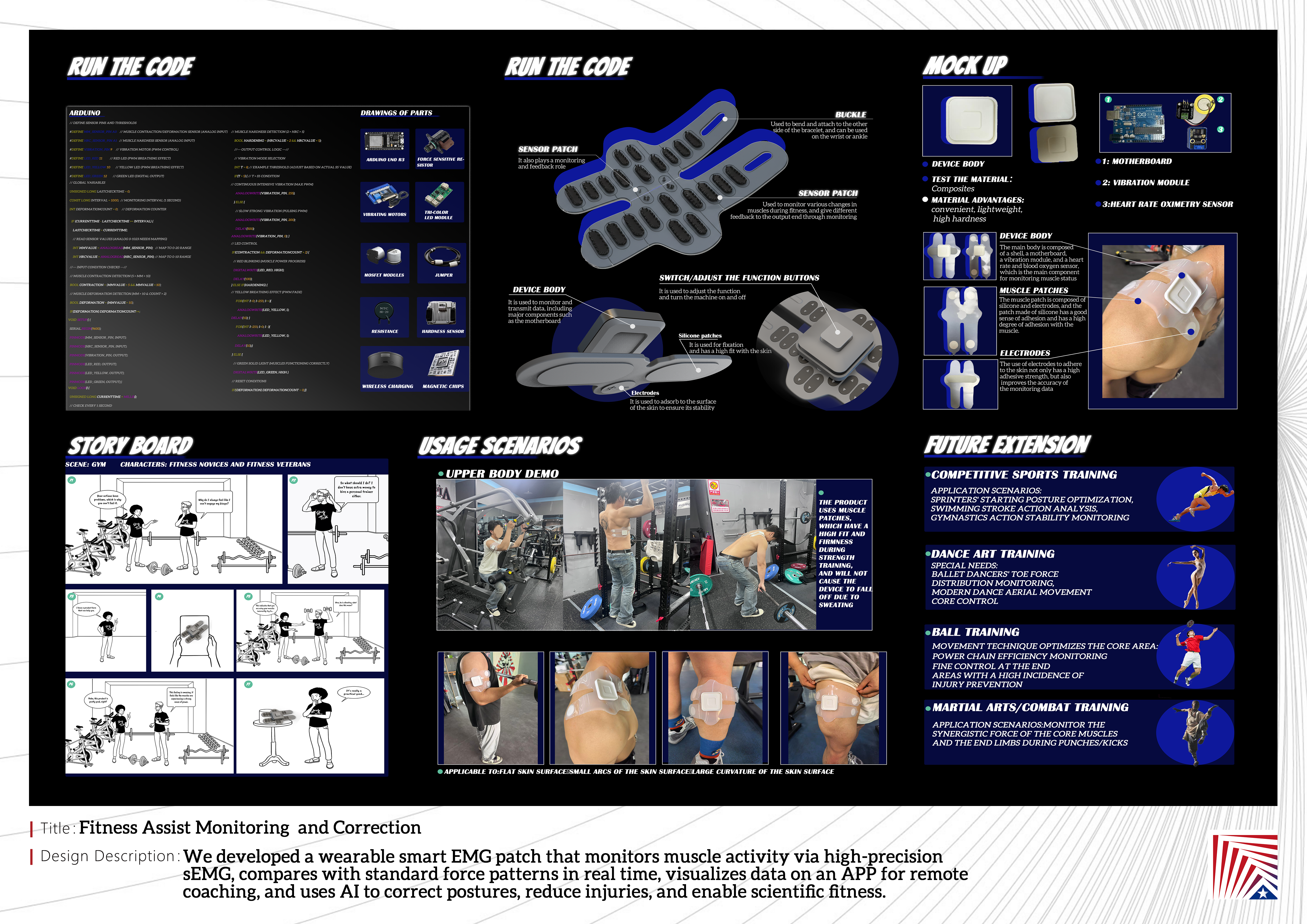 作品说明:In order to solve the problems of sports injuries and inefficient training caused by incorrect postures for fitness novices, we have developed a wearable smart electromyographic patch. The patch monitors muscle activity through high-precision electromyographic signals (sEMG), compares the standard force pattern in real time, and determines the accuracy of the movement.