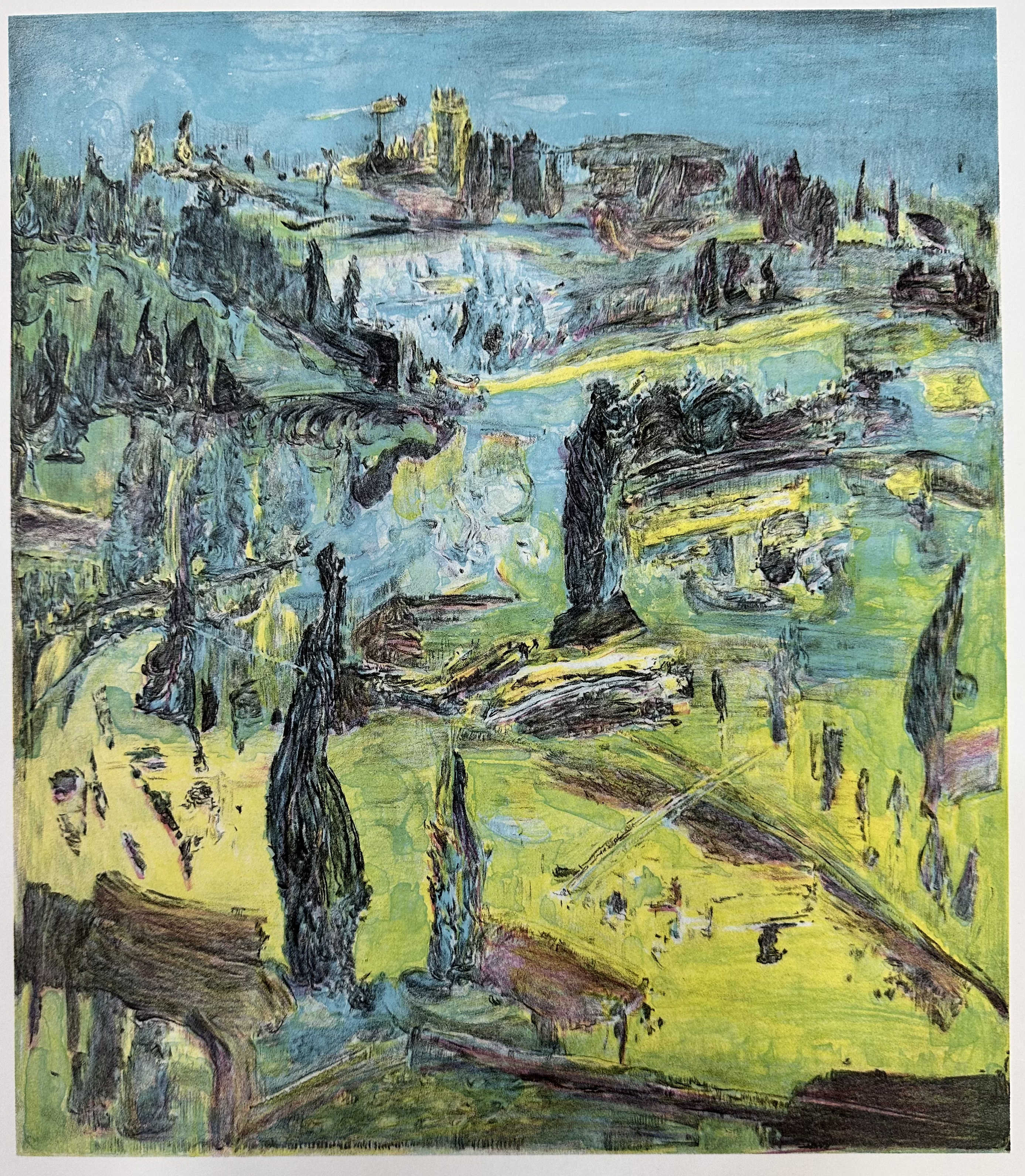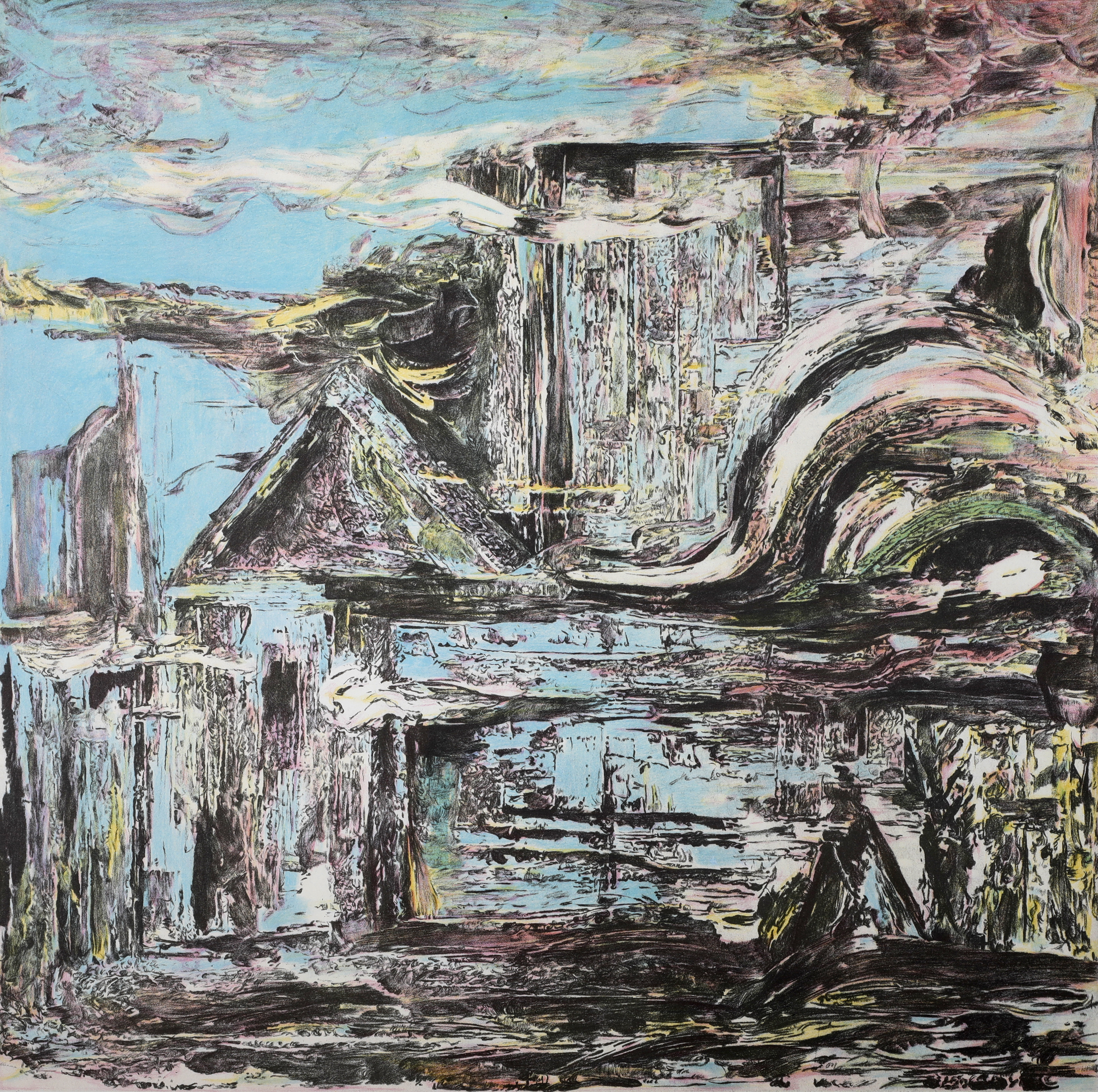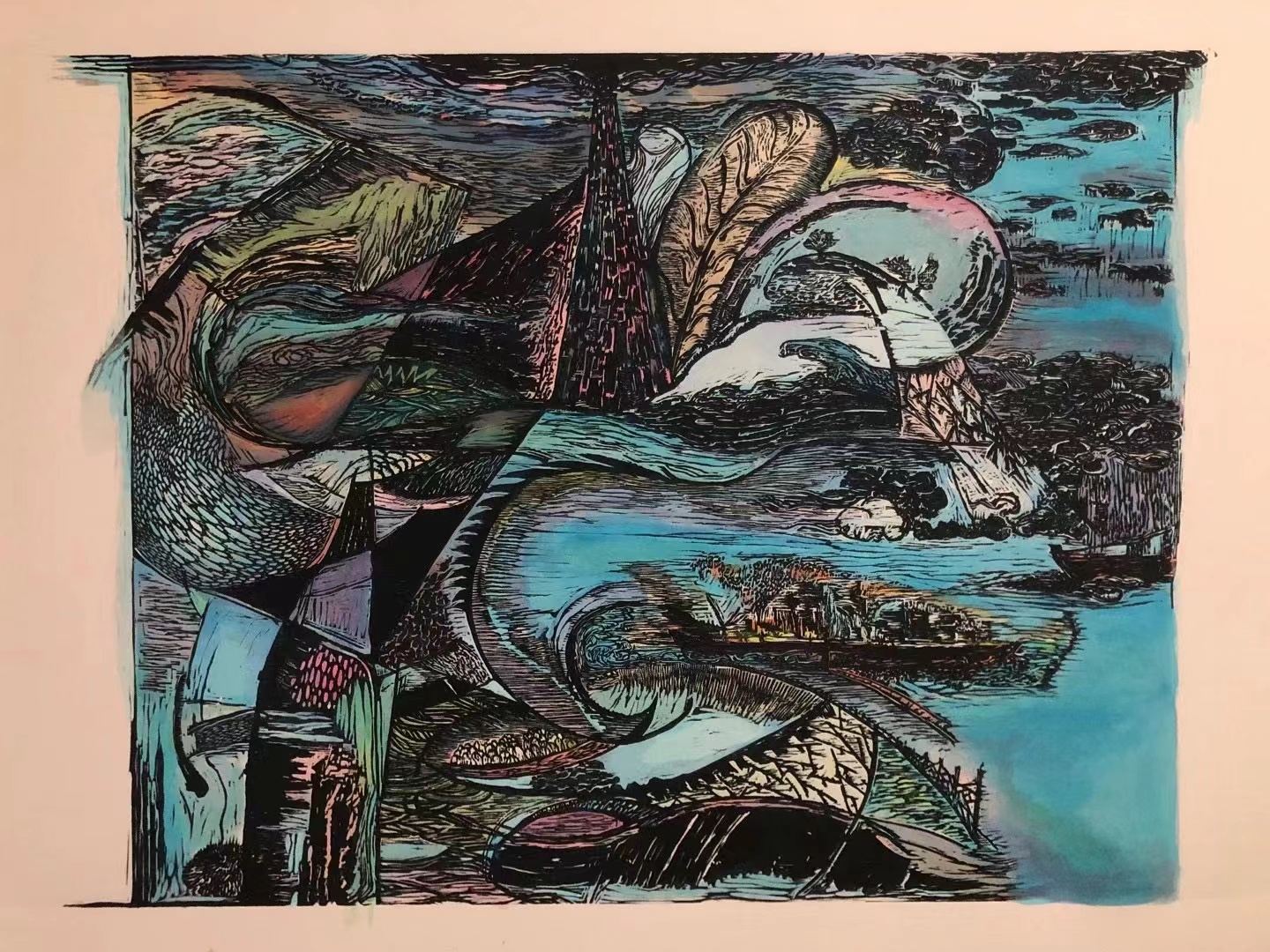 (消逝之梦的碎片)”这一核心概念展开。创作灵感源自现代都市快速变迁与人类内心世界的复杂交织。通过版画媒介特有的肌理与色彩叠加,表达了在高度城市化的进程中,个体情感、集体记忆与城市空间之间不断碰撞、融合、消解与重建的状态。以抽象与具象的交错手法,将记忆视作流动、重构的过程,通过层次丰富的色调与有机线条的组合,模拟记忆片段在意识中的浮现与模糊的边界感;同时,运用版画独特的刻痕与墨色交织,表现城市文明在时间冲刷下的痕迹与沉淀,形成对比鲜明却又和谐统一的视觉语言。在整体构图中,利用虚实相间、动静结合的表现手法,展现了“记忆”与“现实”之间边界的模糊性。色彩选择上,以蓝色调为主导,象征记忆的忧郁与深邃,辅以跳跃的亮色,暗示个体记忆的片段性与不确定性。线条的自由流动,则代表了意识的漂移与记忆的随机性。不仅表达对城市化进程中记忆消逝的感伤,更体现出对人类情感世界和历史脉络的思考与关怀,呼吁观众在快速的现代生活节奏中,重新关注并珍视自身与历史的联结。