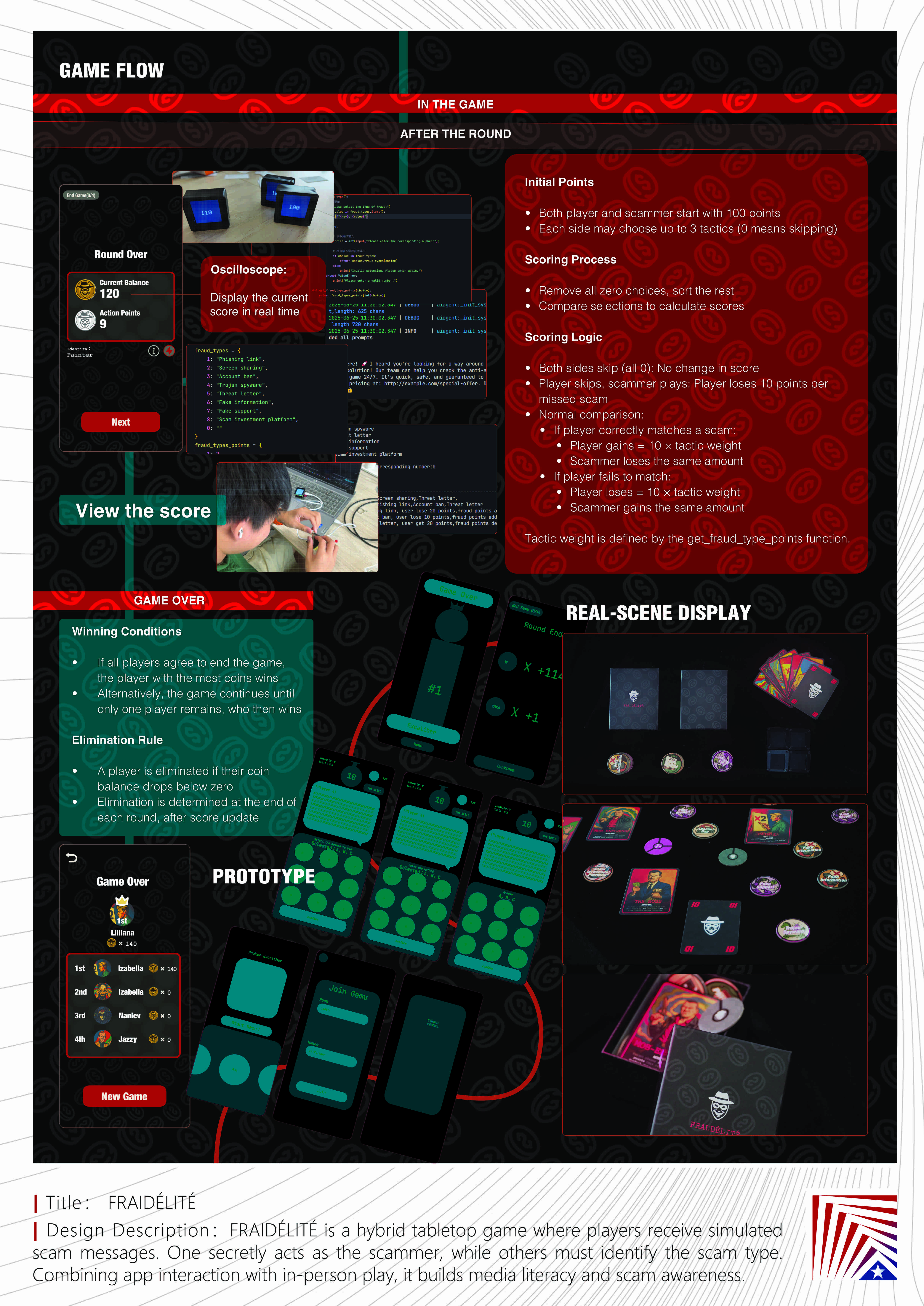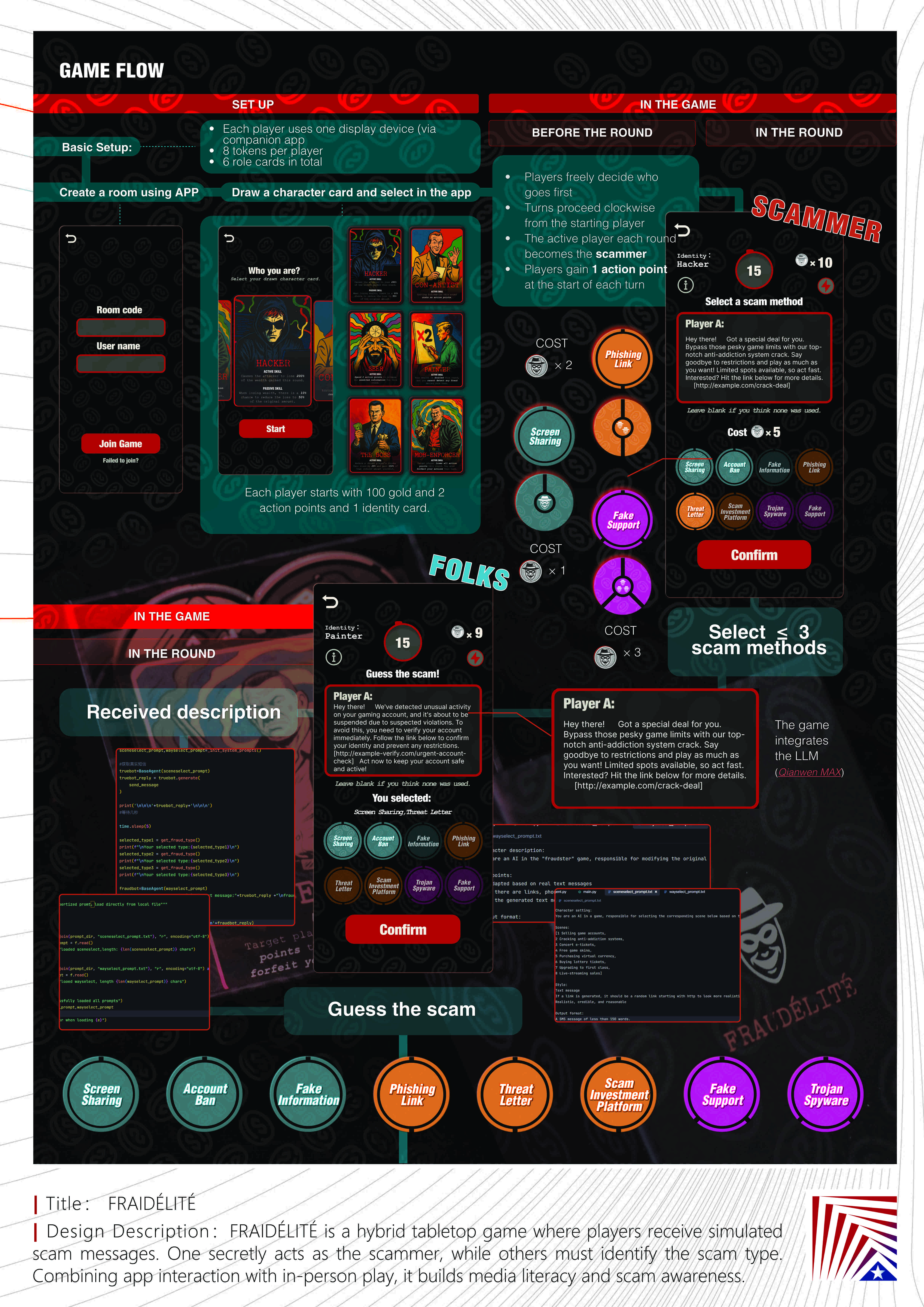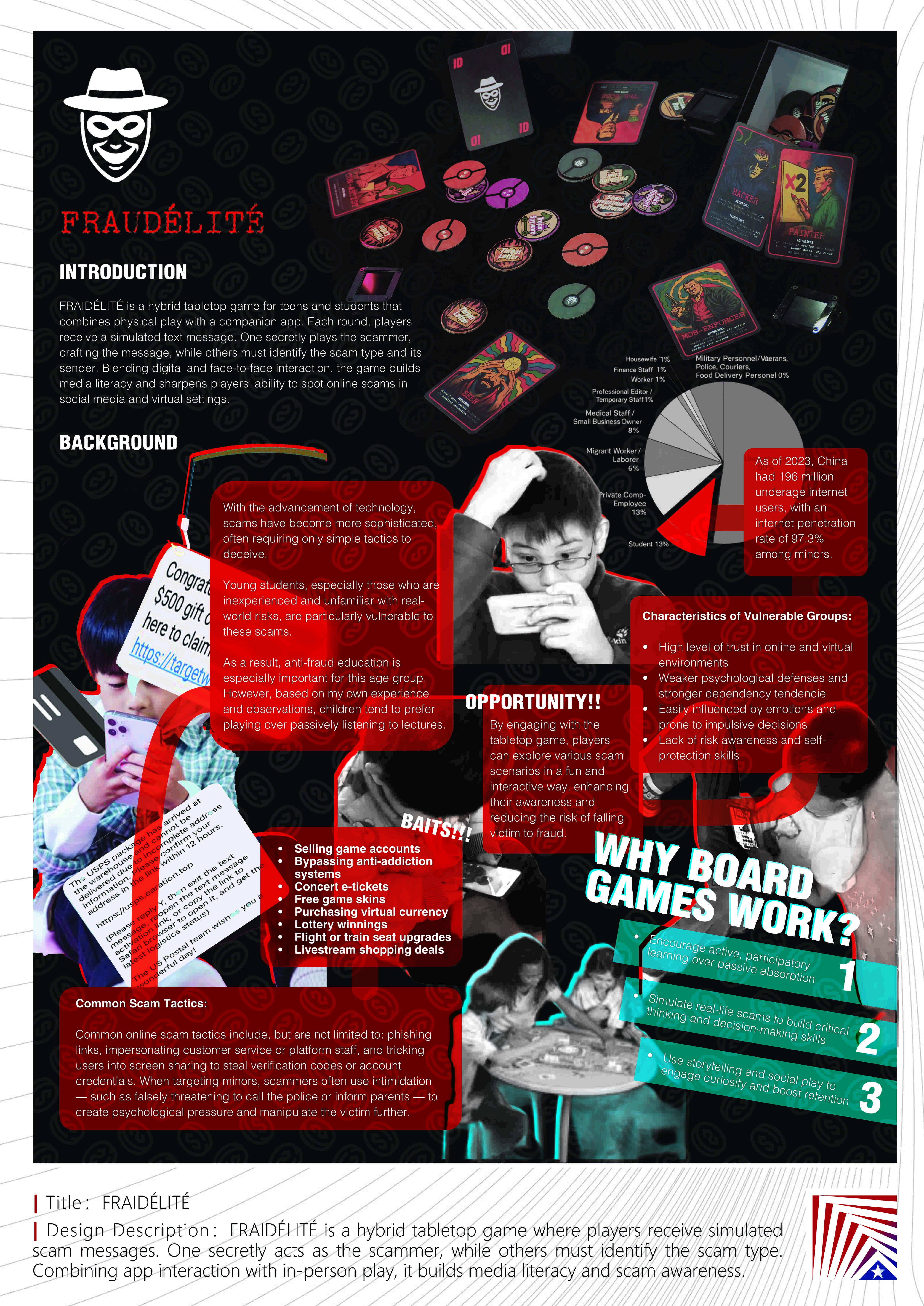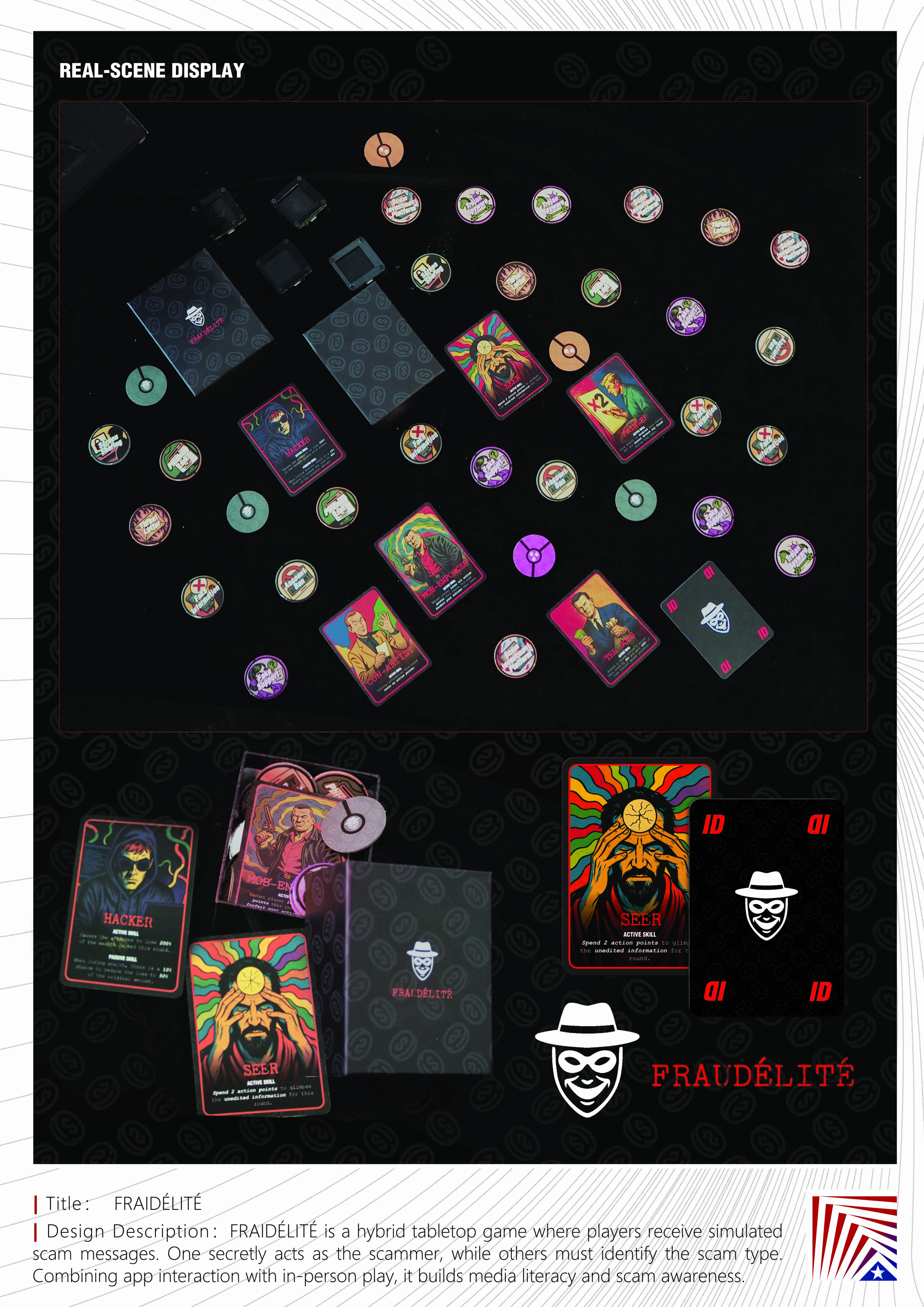 作品说明:《FRAIDÉLITÉ》是一款专为青少年与学生设计的混合式桌面游戏,结合实体卡牌玩法与配套 App。每轮游戏中,玩家将收到一条模拟诈骗信息,其中一人秘密扮演诈骗者,负责构造信息内容,其余玩家则需识别诈骗类型并找出发送者。通过线上与线下互动融合,游戏帮助玩家提升媒介素养与识别网络诈骗的能力,尤其是在社交媒体与虚拟环境中。