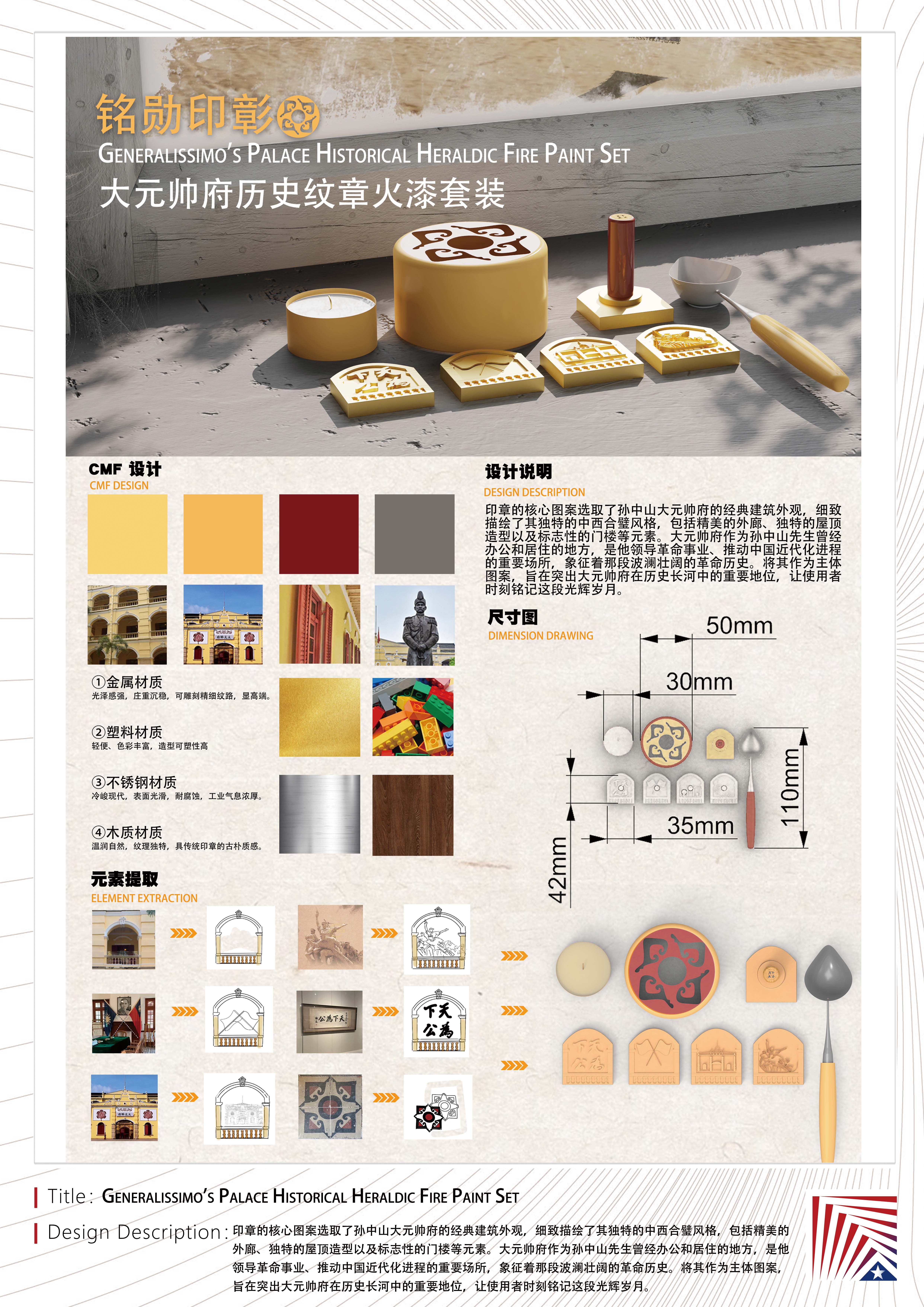 作品说明:印章的核心图案选取了孙中山大元帅府的经典建筑外观,细致描绘了其独特的中西合璧风格,包括精美的外廊、独特的屋顶造型以及标志性的门楼等元素。大元帅府作为孙中山先生曾经办公和居住的地方,是他领导革命事业、推动中国近代化进程的重要场所,象征着那段波澜壮阔的革命历史。将其作为主体图案,旨在突出大元帅府在历史长河中的重要地位,让使用者时刻铭记这段光辉岁月。The core design of the seal is a classic architectural appearance of the Generalissimo Sun Yat-sen’s palace, detailing its unique East-meets-West style, including elements such as exquisite verandahs, unique roof shapes, and iconic gatehouses. As the place where Dr. Sun Yat-sen once worked and lived, the Generalissimo’s Mansion was an important place for him to lead the revolutionary cause and promote the process of China’s modernization, symbolizing that magnificent revolutionary history. It is used as the main motif to highlight the important position of the Generalissimo’s Palace in the long history, so that users can always remember this glorious time.