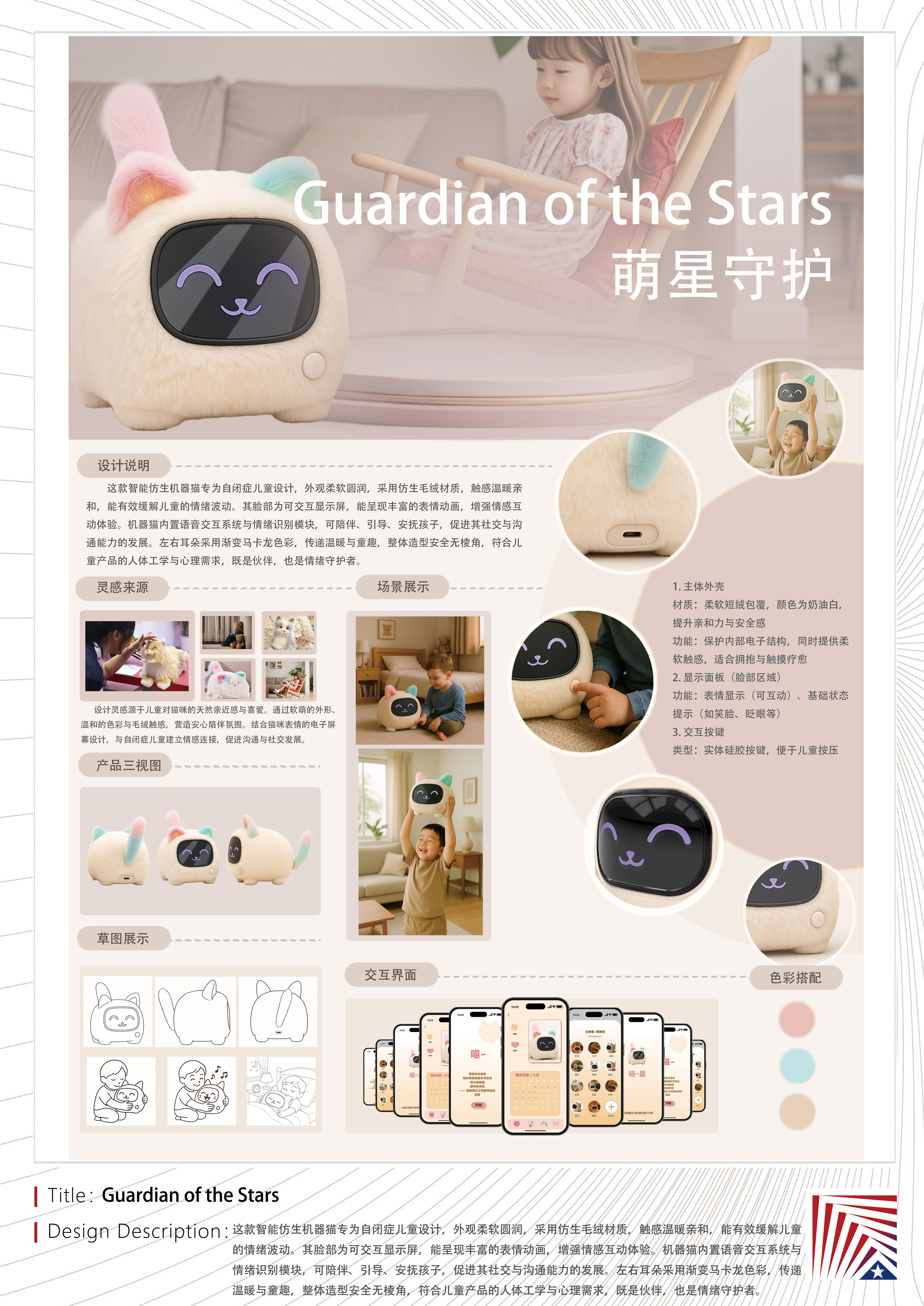 作品说明:这款智能仿生机器猫专为自闭症儿童设计,外观柔软圆润,采用仿生毛绒材质,触感温暖亲和,能有效缓解儿童的情绪波动。其脸部为可交互显示屏,能呈现丰富的表情动画,增强情感互动体验。机器猫内置语音交互系统与情绪识别模块,可陪伴、引导、安抚孩子,促进其社交与沟通能力的发展。左右耳朵采用渐变马卡龙色彩,传递温暖与童趣,整体造型安全无棱角,符合儿童产品的人体工学与心理需求,既是伙伴,也是情绪守护者。Specially designed for children with autism, this intelligent bionic robot cat has a soft and rounded appearance, and is made of bionic plush material, which is warm and friendly to the touch, which can effectively alleviate children’s mood swings. Its face is an interactive display, which can present rich expression animations to enhance the emotional interaction experience. The robot cat has a built-in voice interaction system and an emotion recognition module, which can accompany, guide and comfort children, and promote the development of their social and communication skills. The left and right ears are made of gradient macaron color, conveying warmth and childlike fun, and the overall shape is safe and angular, which meets the ergonomic and psychological needs of children’s products, which is both a partner and an emotional guardian.