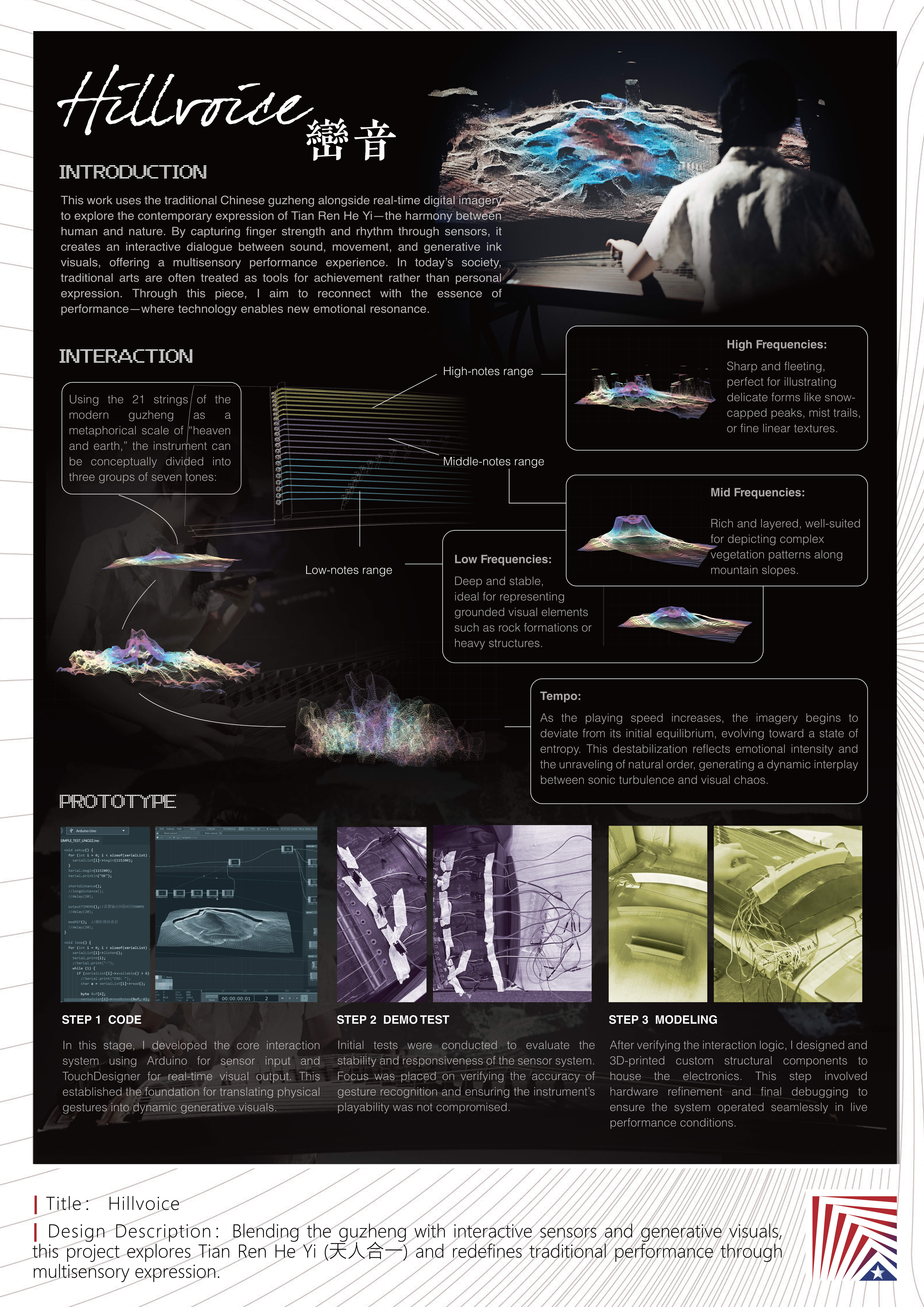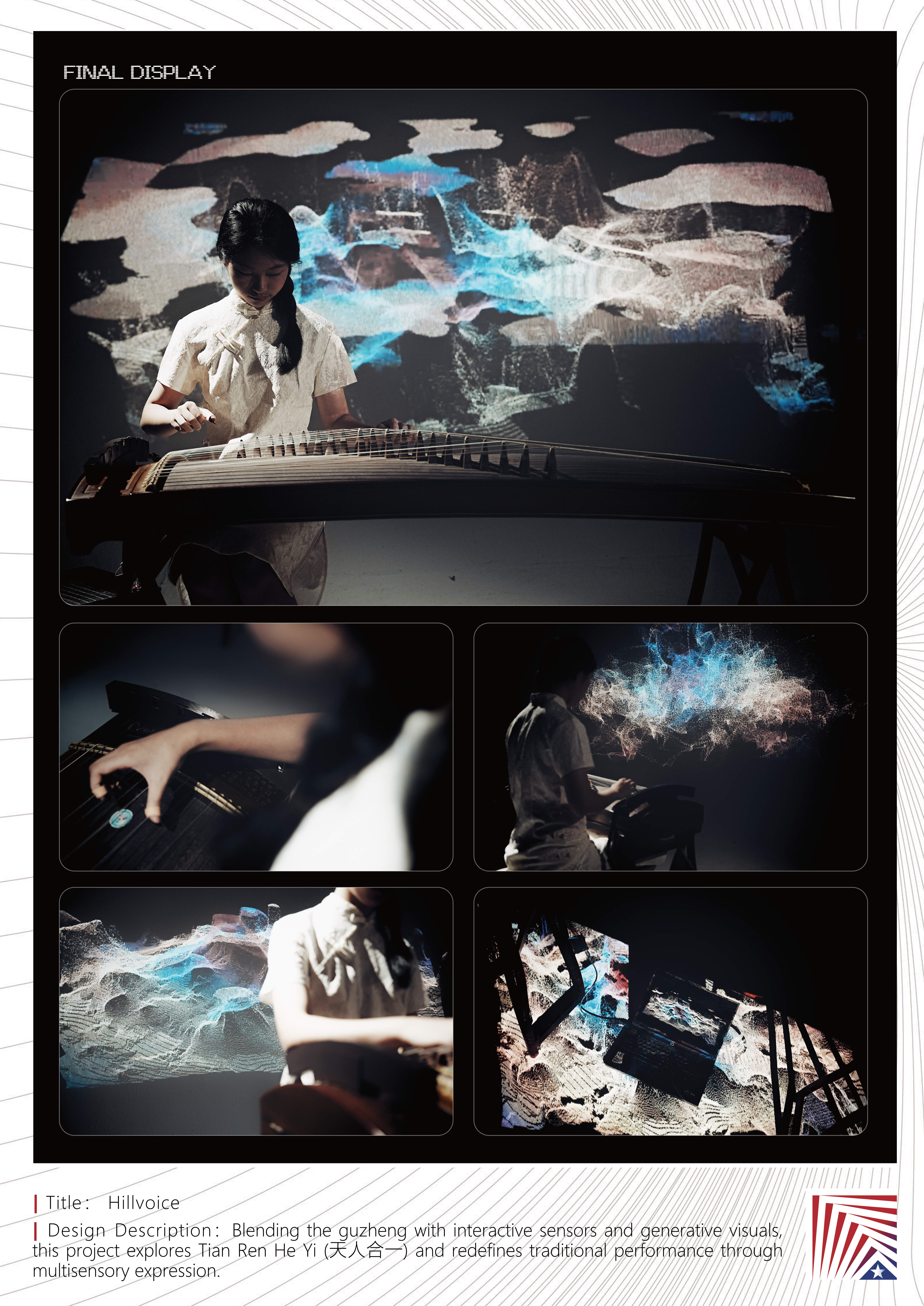 作品说明:Blending the guzheng with interactive sensors and generative visuals, this project explores Tian Ren He Yi (天人合一) and redefines traditional performance through multisensory expression.