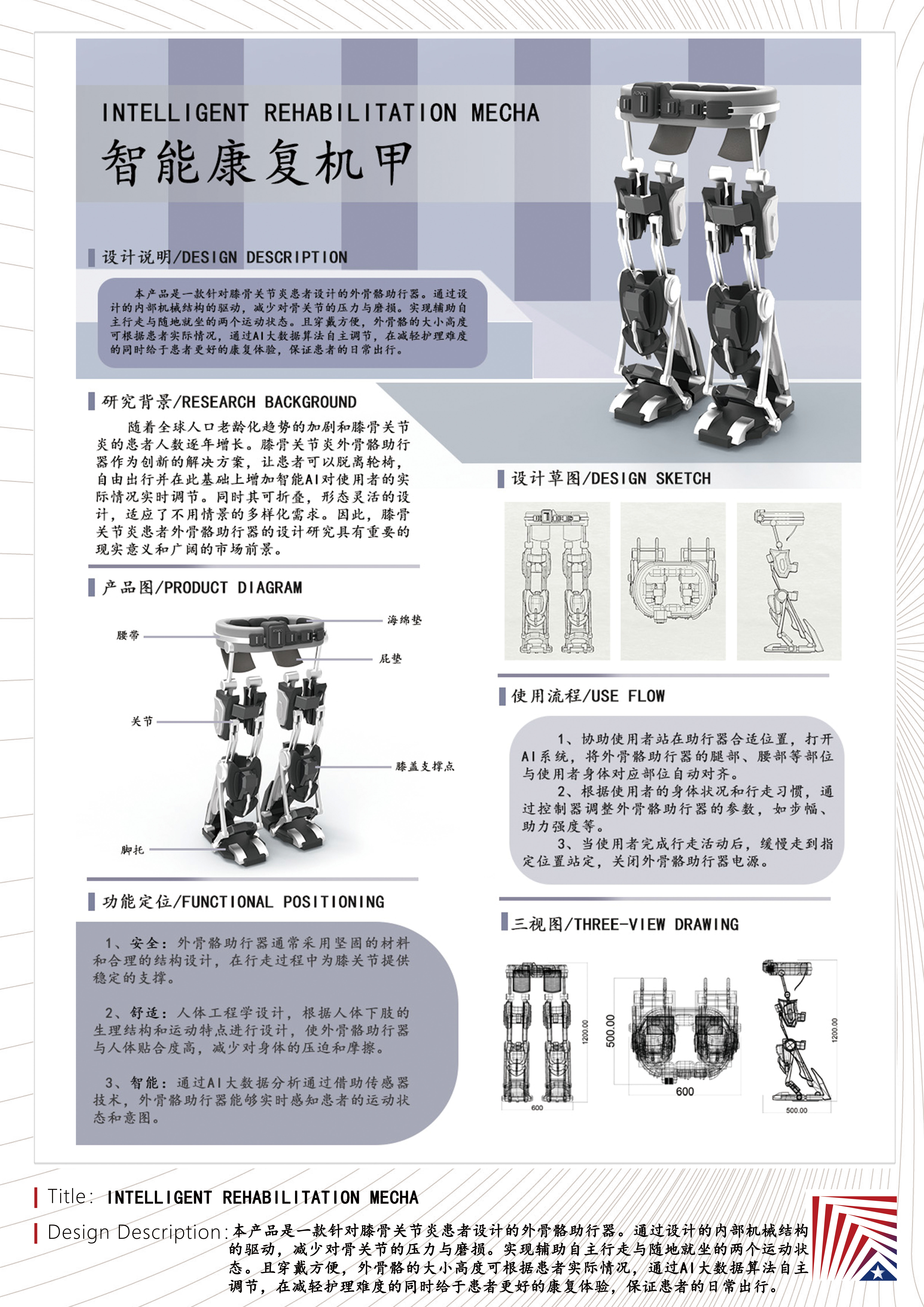 作品说明:本产品是一款针对膝骨关节炎患者设计的外骨骼助行器。通过设计的内部机械结构的驱动,减少对骨关节的压力与磨损。实现辅助自主行走与随地就坐的两个运动状态。且穿戴方便,外骨骼的大小高度可根据患者实际情况,通过AI大数据算法自主调节,在减轻护理难度的同时给于患者更好的康复体验,保证患者的日常出行。This product is an exoskeleton walker designed for patients with knee osteoarthritis. Through the design of the internal mechanical structure of the drive, the pressure and wear on the bone and joint are reduced. Realize the two movement states of assisted autonomous walking and sitting. And it is easy to wear, and the size and height of the exoskeleton can be adjusted independently according to the actual situation of the patient, through the AI big data algorithm, which can reduce the difficulty of nursing while giving the patient a better rehabilitation experience and ensuring the daily travel of the patient.
