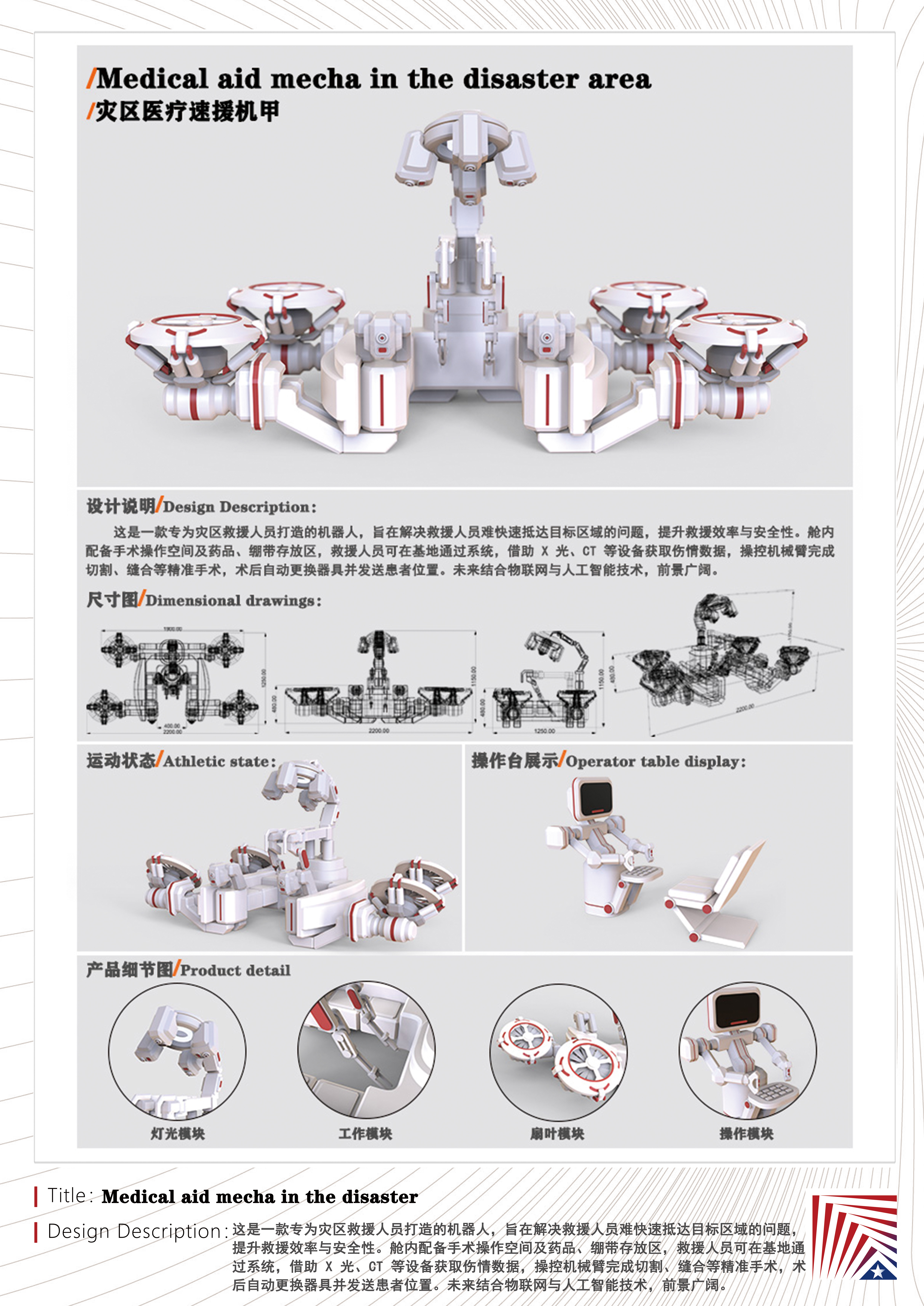 作品说明:这是一款专为灾区救援人员打造的机器人,旨在解决救援人员难快速抵达目标区域的问题,提升救援效率与安全性。舱内配备手术操作空间及药品、绷带存放区,救援人员可在基地通过系统,借助 X 光、CT 等设备获取伤情数据,操控机械臂完成切割、缝合等精准手术,术后自动更换器具并发送患者位置。未来结合物联网与人工智能技术,前景广阔。This is a robot specially designed for rescuers in disaster areas, aiming to solve the problem that rescuers are difficult to quickly reach the target area, and improve rescue efficiency and safety. The cabin is equipped with a surgical operation space and a storage area for medicines and bandages, and rescuers can obtain injury data through the system at the base, with the help of X-ray, CT and other equipment, control the robotic arm to complete precise operations such as cutting and suturing, and automatically change the instruments and send the patient’s position after surgery. In the future, the combination of Internet of Things and artificial intelligence technology has broad prospects.