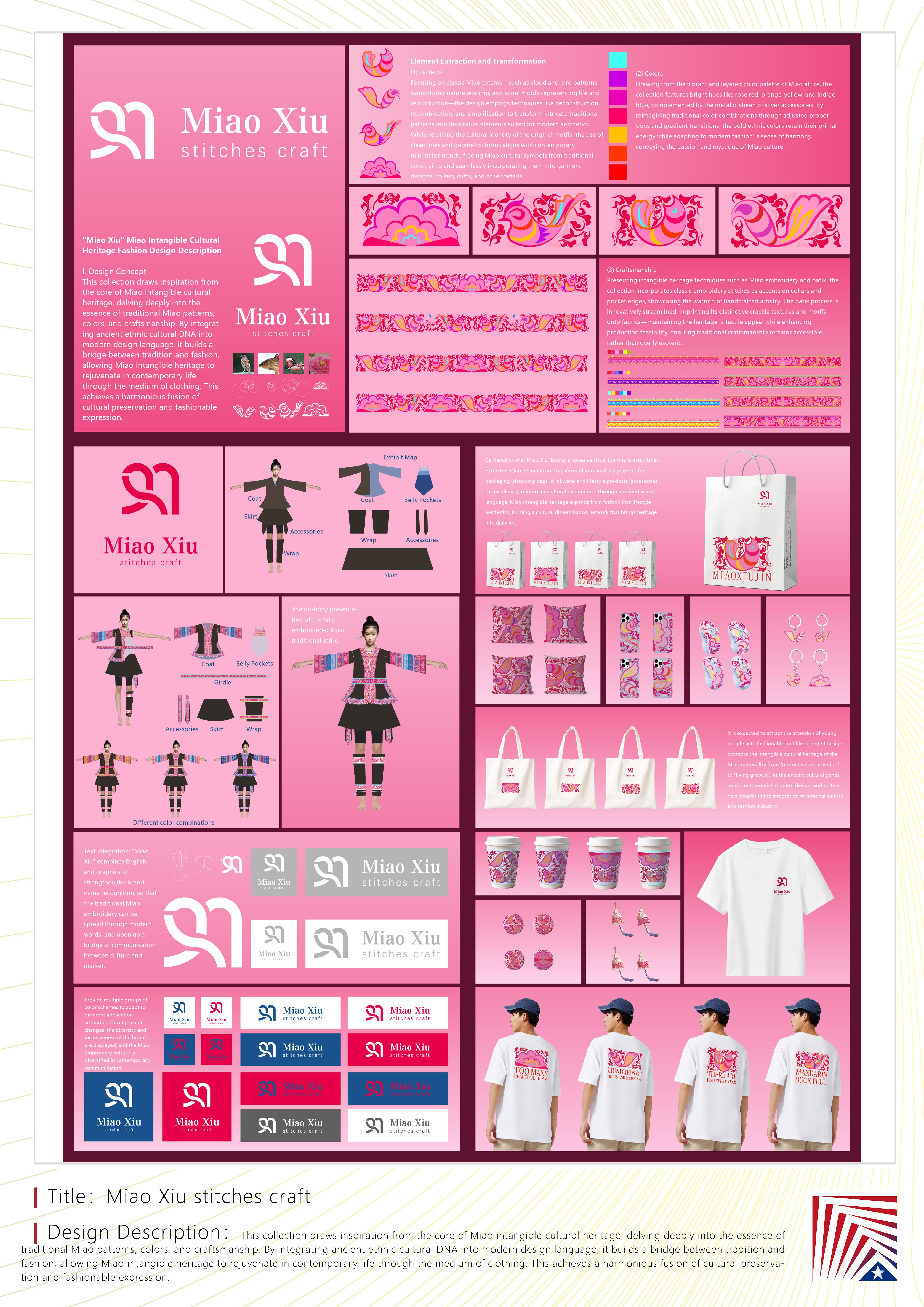 作品说明:This collection draws inspiration from the core of Miao intangible cultural heritage, delving deeply into the essence of traditional Miao patterns, colors, and craftsmanship. By integrating ancient ethnic cultural DNA into modern design language, it builds a bridge between tradition and fashion, allowing Miao intangible heritage to rejuvenate in contemporary life through the medium of clothing. This achieves a harmonious fusion of cultural preservation and fashionable expression.