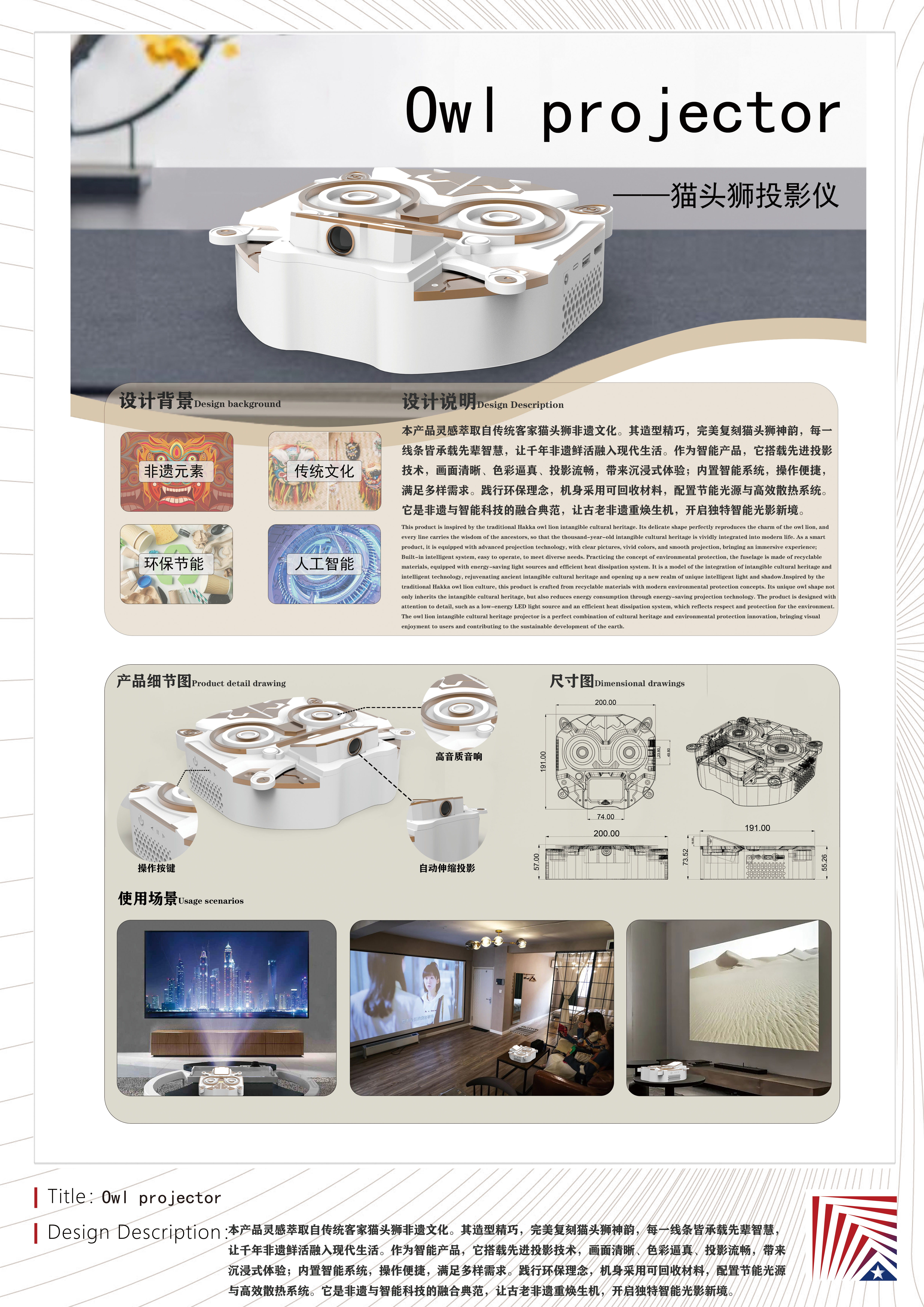 作品说明:本产品灵感萃取自传统客家猫头狮非遗文化。其造型精巧,完美复刻猫头狮神韵,每一线条皆承载先辈智慧,让千年非遗鲜活融入现代生活。作为智能产品,它搭载先进投影技术,画面清晰、色彩逼真、投影流畅,带来沉浸式体验;内置智能系统,操作便捷,满足多样需求。践行环保理念,机身采用可回收材料,配置节能光源与高效散热系统。它是非遗与智能科技的融合典范,让古老非遗重焕生机,开启独特智能光影新境。This product is inspired by the traditional Hakka owl lion intangible cultural heritage. Its delicate shape perfectly reproduces the charm of the owl lion, and every line carries the wisdom of the ancestors, so that the thousand-year-old intangible cultural heritage is vividly integrated into modern life. As a smart product, it is equipped with advanced projection technology, with clear pictures, vivid colors, and smooth projection, bringing an immersive experience; Built-in intelligent system, easy to operate, to meet diverse needs. Practicing the concept of environmental protection, the fuselage is made of recyclable materials, equipped with energy-saving light sources and efficient heat dissipation system. It is a model of the integration of intangible cultural heritage and intelligent technology, rejuvenating ancient intangible cultural heritage and opening up a new realm of unique intelligent light and shadow.