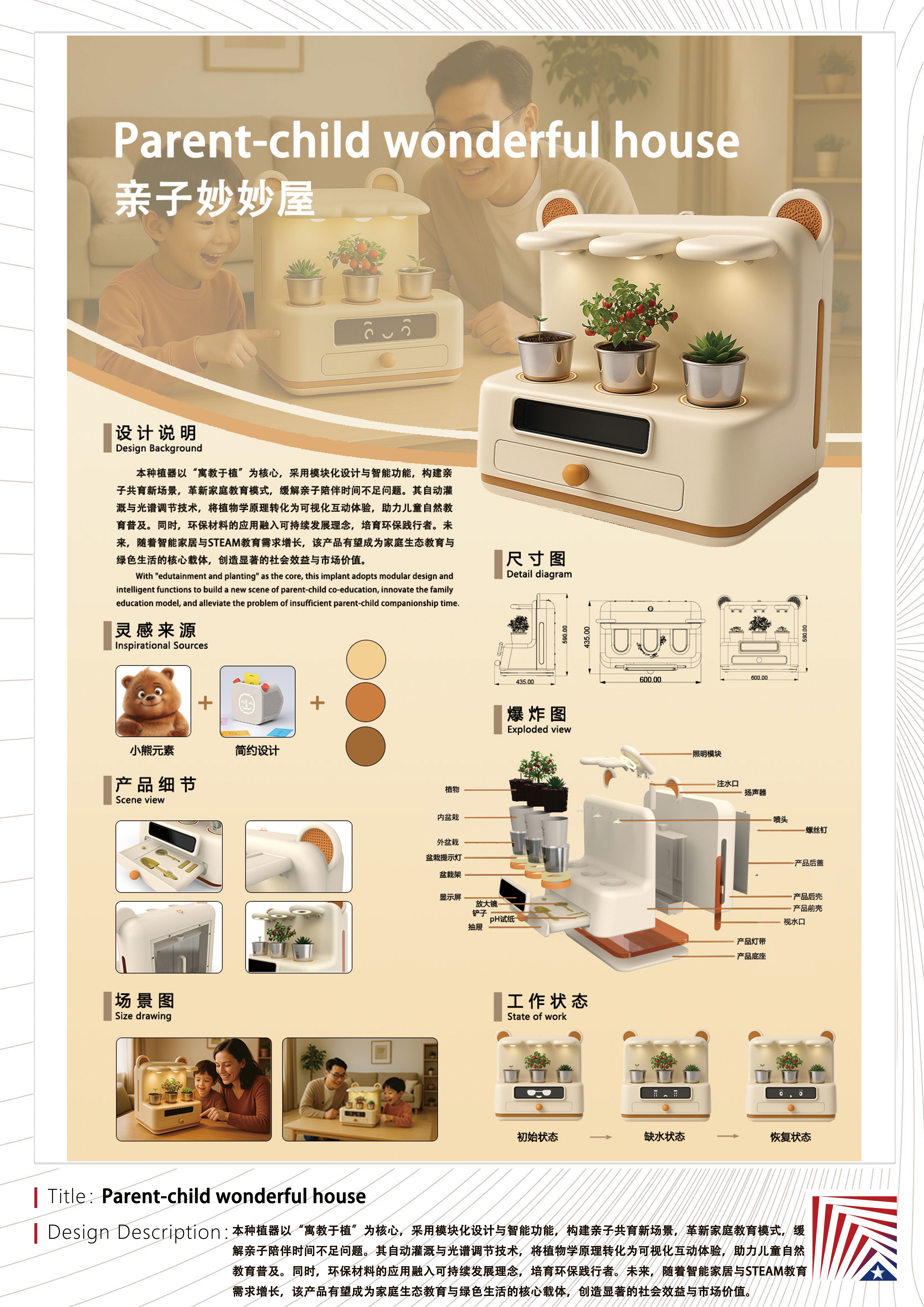 作品说明:本种植器以“寓教于植”为核心,采用模块化设计与智能功能,构建亲子共育新场景,革新家庭教育模式,缓解亲子陪伴时间不足问题。其自动灌溉与光谱调节技术,将植物学原理转化为可视化互动体验,助力儿童自然教育普及。同时,环保材料的应用融入可持续发展理念,培育环保践行者。未来,随着智能家居与STEAM教育需求增长,该产品有望成为家庭生态教育与绿色生活的核心载体,创造显著的社会效益与市场价值。With “edutainment and planting” as the core, this implant adopts modular design and intelligent functions to build a new scene of parent-child co-education, innovate the family education model, and alleviate the problem of insufficient parent-child companionship time. Its automatic irrigation and spectral adjustment technology transforms botanical principles into visual interactive experiences, helping to popularize children’s nature education. At the same time, the application of environmentally friendly materials integrates the concept of sustainable development and cultivates environmental protection practitioners. In the future, with the growth of demand for smart home and STEAM education, the product is expected to become the core carrier of family ecological education and green life, creating significant social benefits and market value.