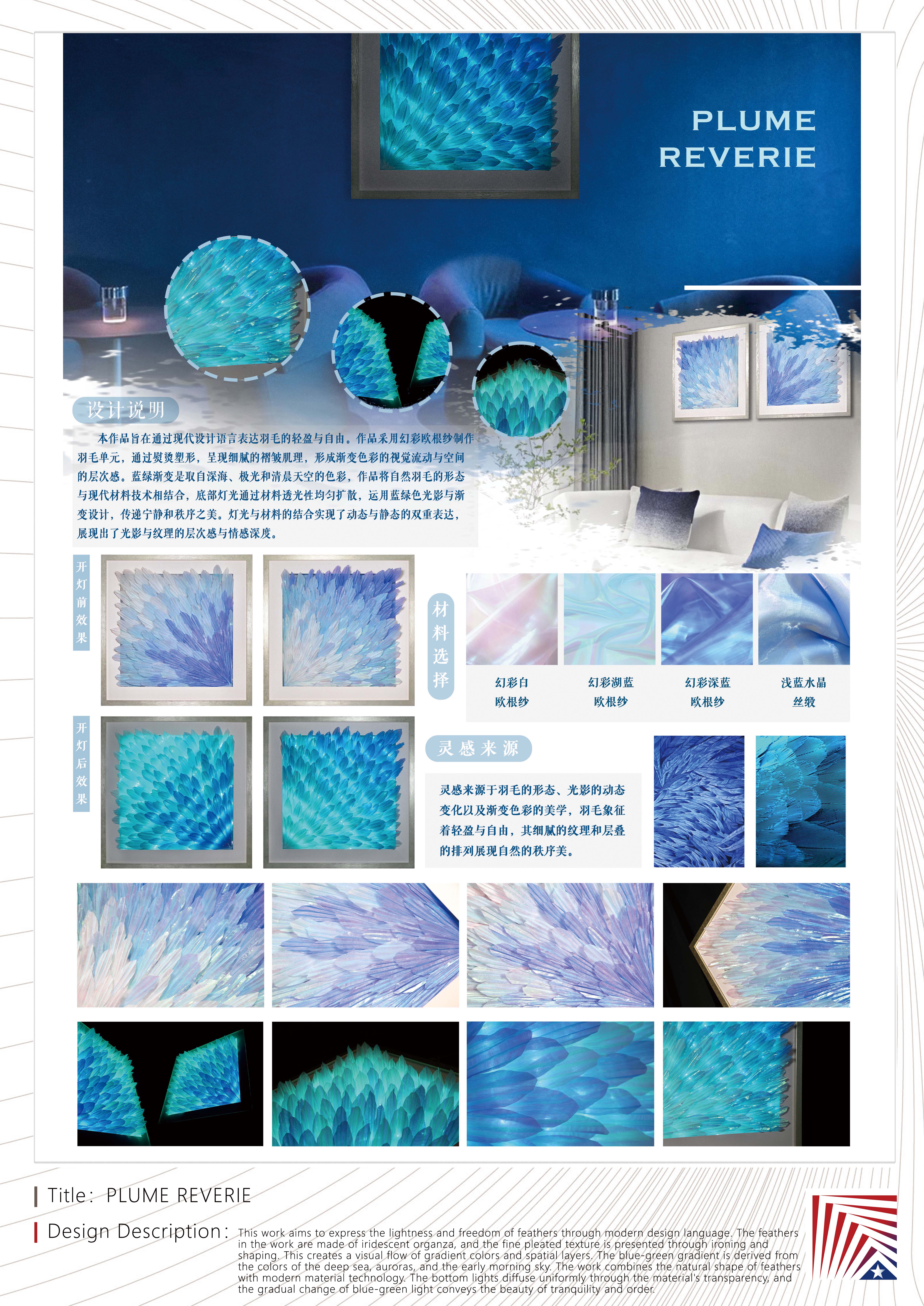 作品说明:本作品旨在通过现代设计语言表达羽毛的轻盈与自由,同时创造了一个促进情绪舒缓、心灵沉静的疗愈性场域,引导观者在光影流动间开启自我关照的宁静之旅。作品采用幻彩欧根纱制作羽毛单元,通过熨烫塑形,呈现细腻的褶皱肌理,形成渐变色彩的视觉流动与空间的层次感。蓝绿渐变是取自深海、极光和清晨天空的色彩,作品将自然羽毛的形态与现代材料技术相结合,底部灯光通过材料透光性均匀扩散,运用蓝绿色光影与渐变设计,传递宁静和秩序之美。灯光与材料的结合实现了动态与静态的双重表达,展现出了光影与纹理的层次感与情感深度,在现代空间中搭建连接自然本源的桥梁,唤起内在宁静与归属感。