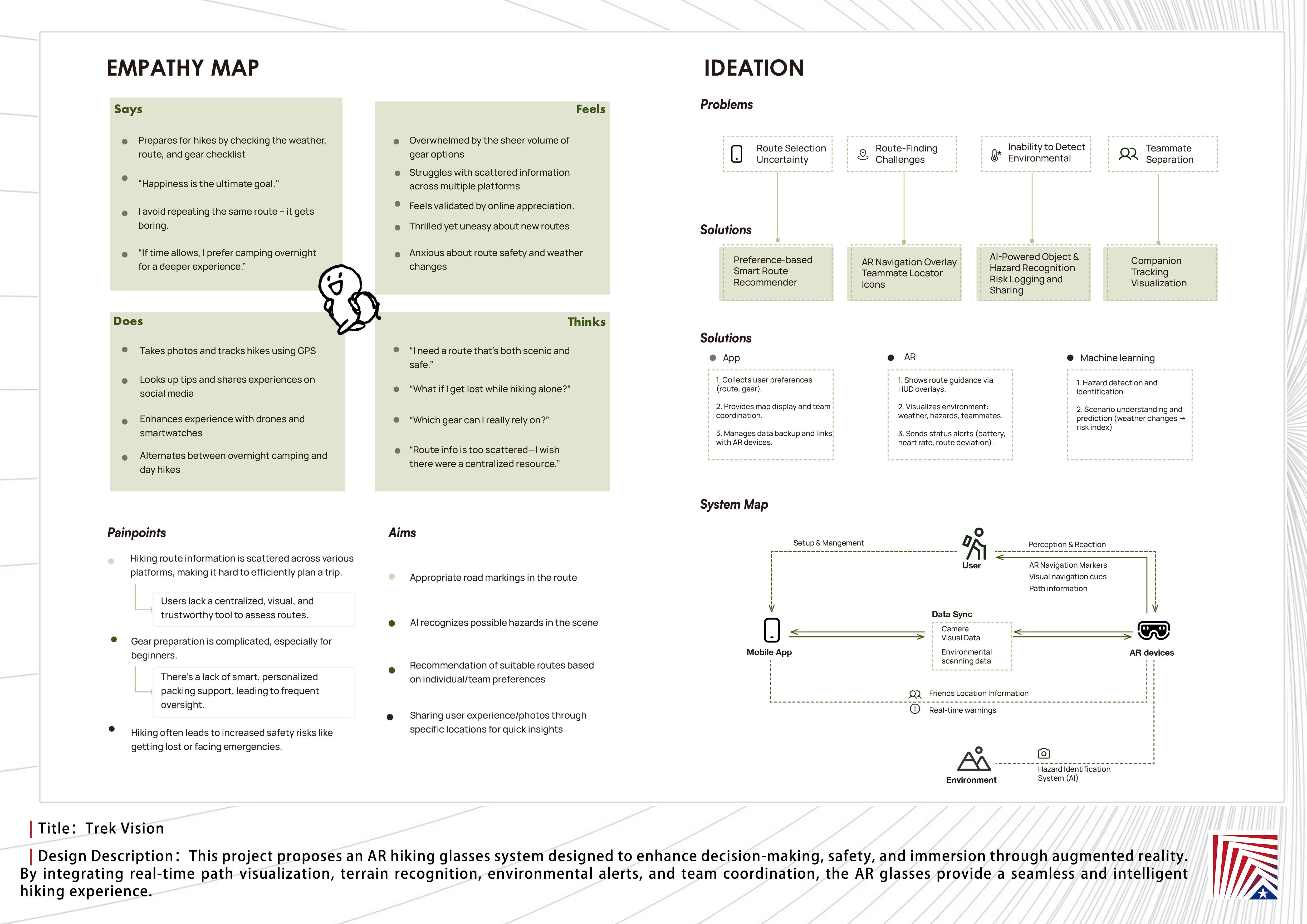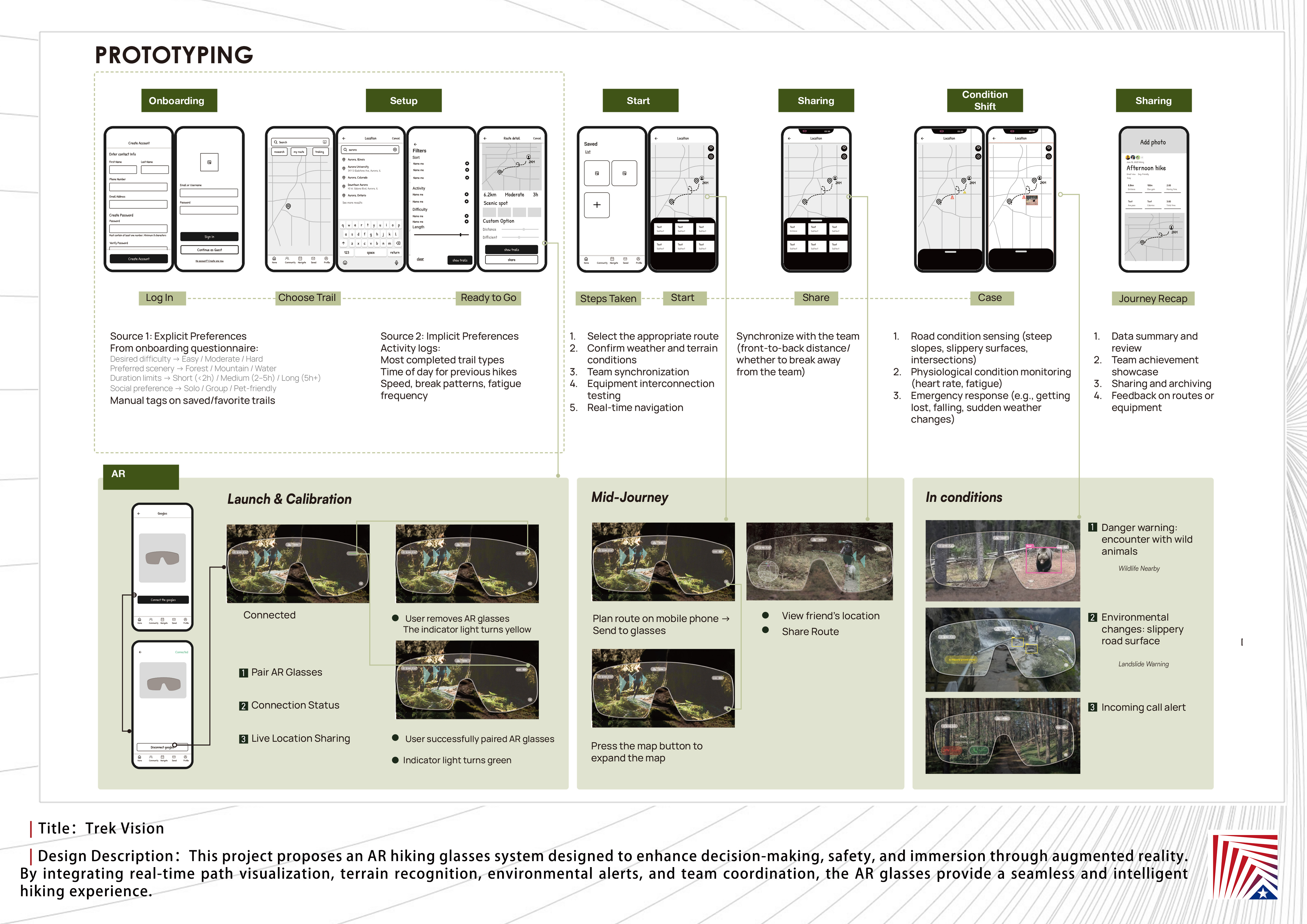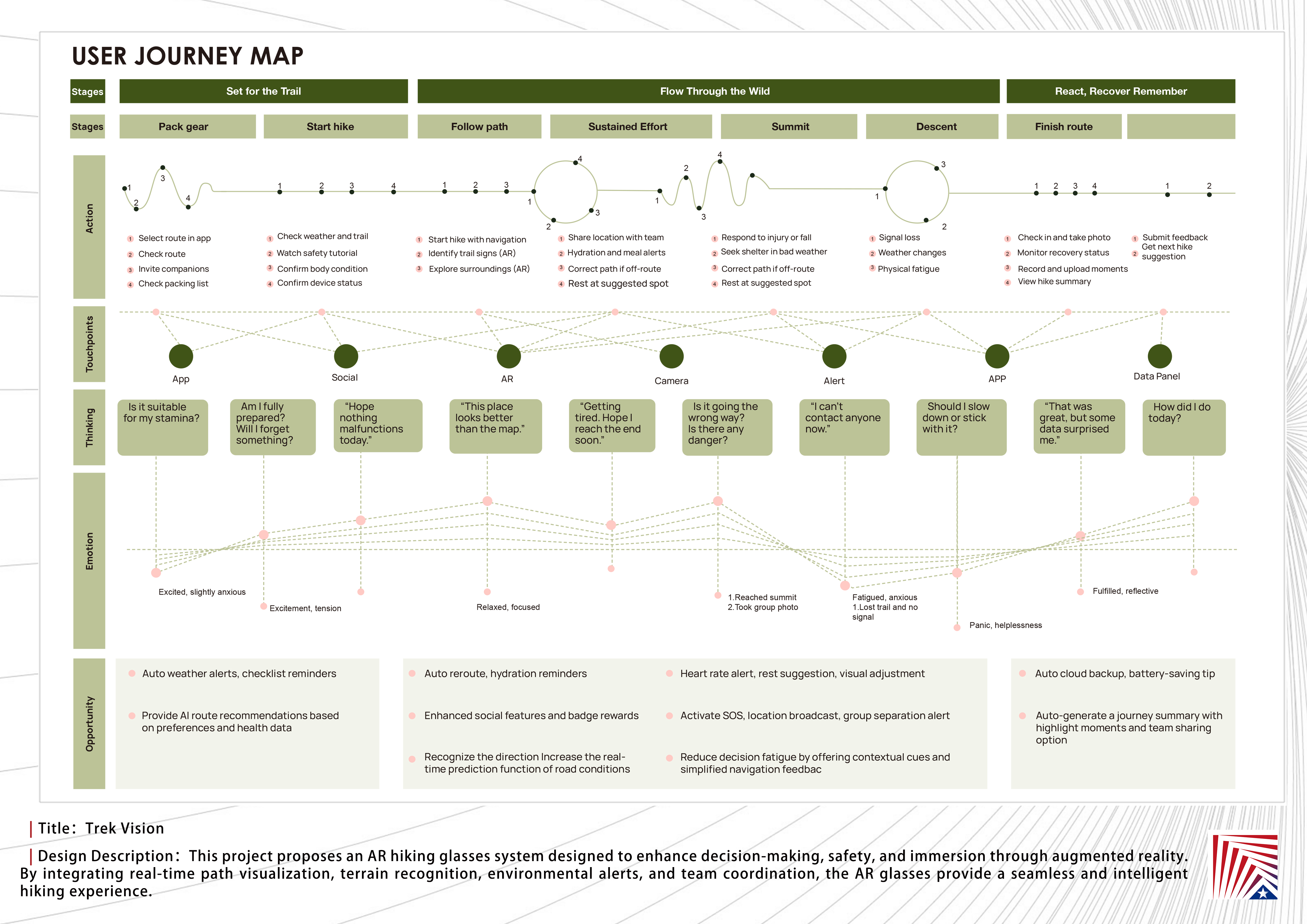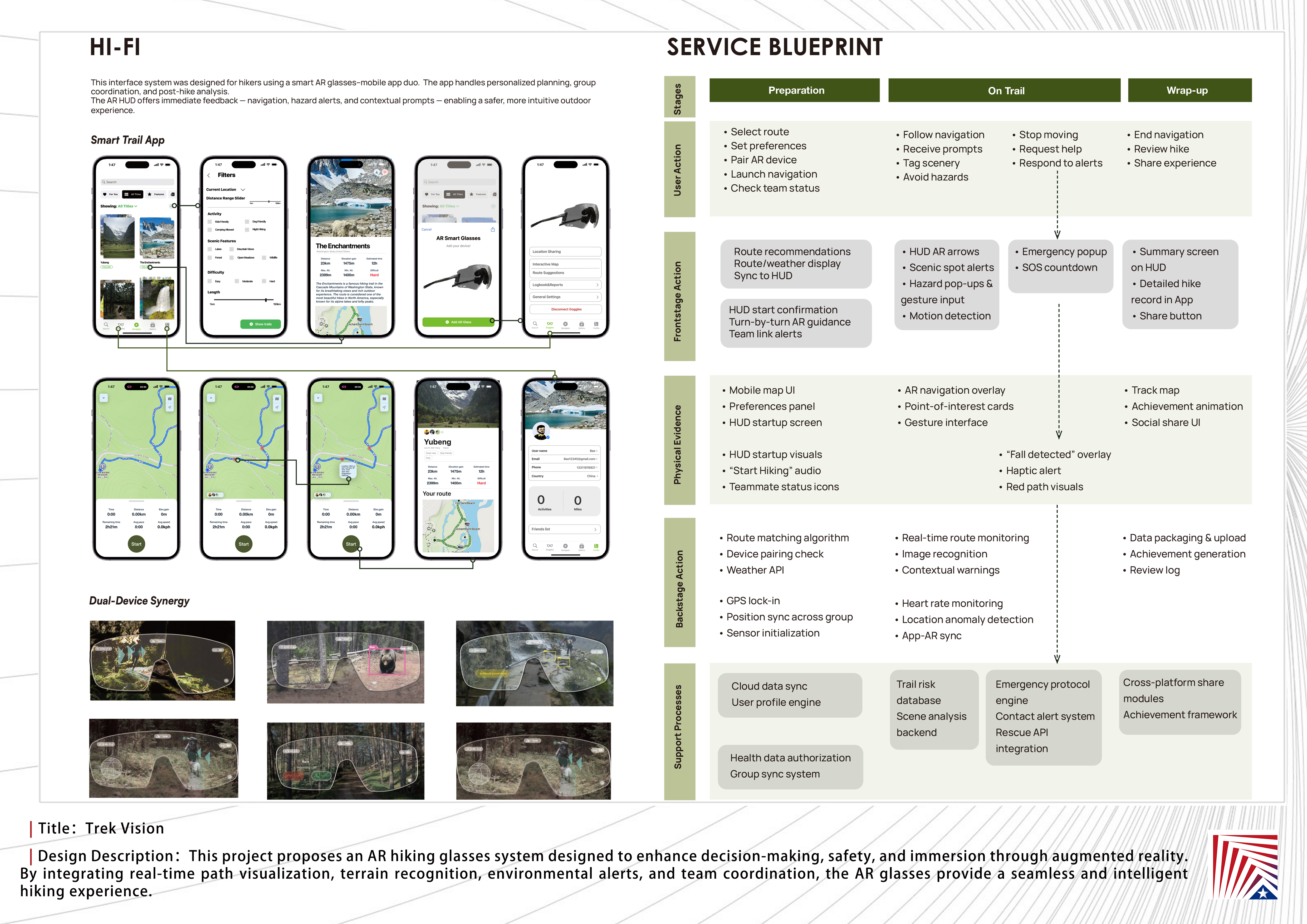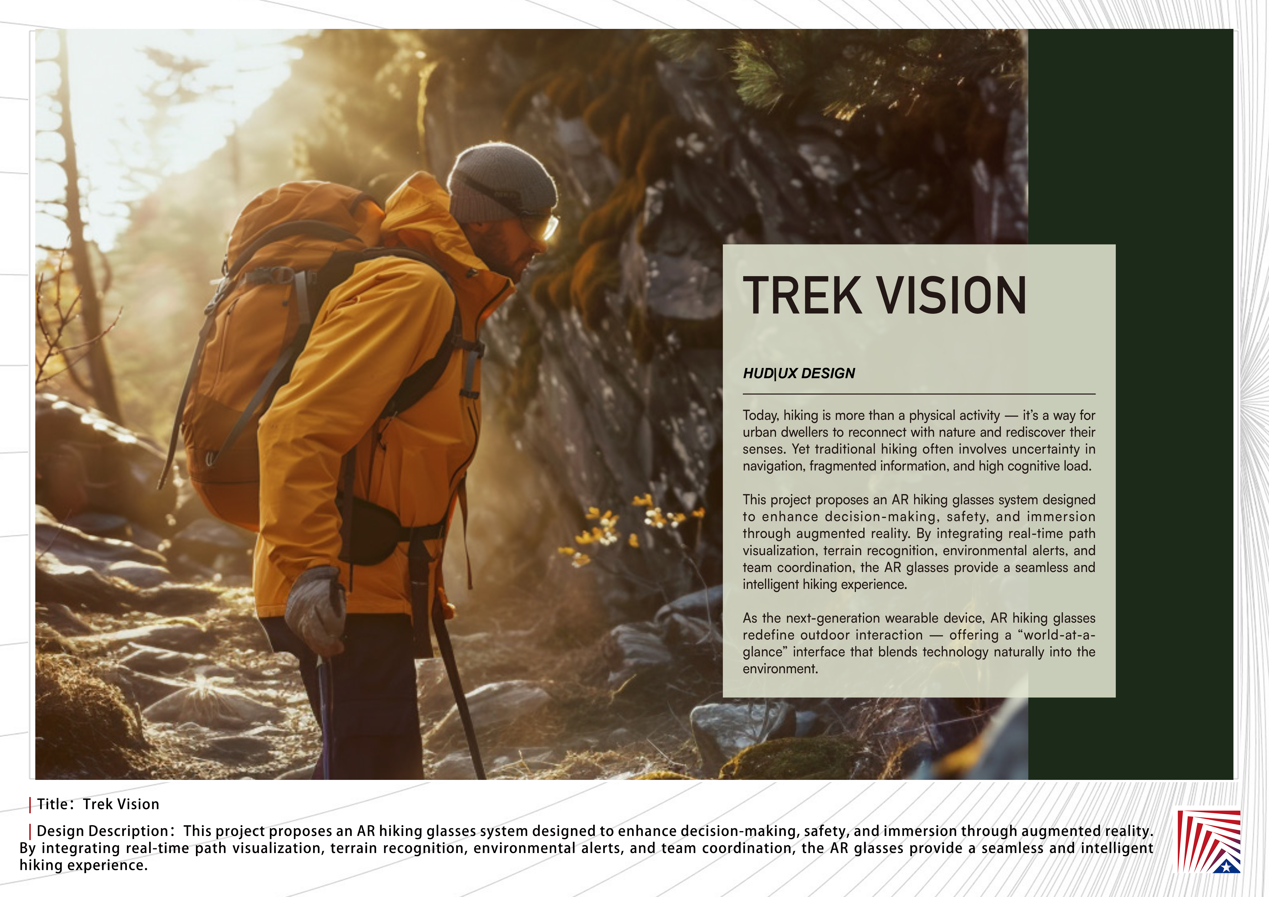 作品说明:Today, hiking is more than a physical activity — it’s a way for urban dwellers to reconnect with nature and rediscover their senses. Yet traditional hiking often involves uncertainty in navigation, fragmented information, and high cognitive load.